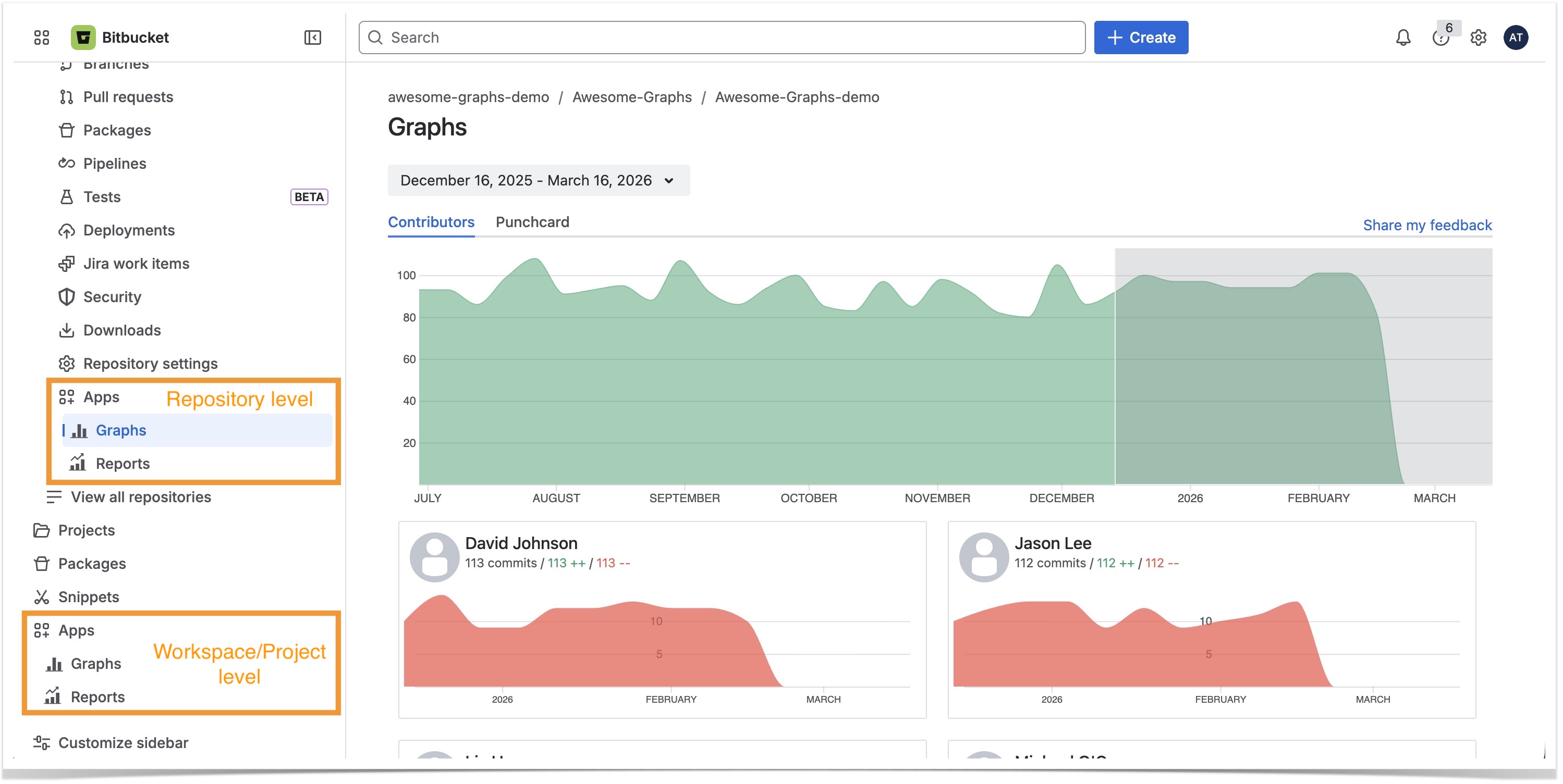 To access the graphs and reports, you need to go to the workspace or repository in Bitbucket you'd like to examine and click on the Graphs or Reports icons in the left-hand navigation bar under Apps.