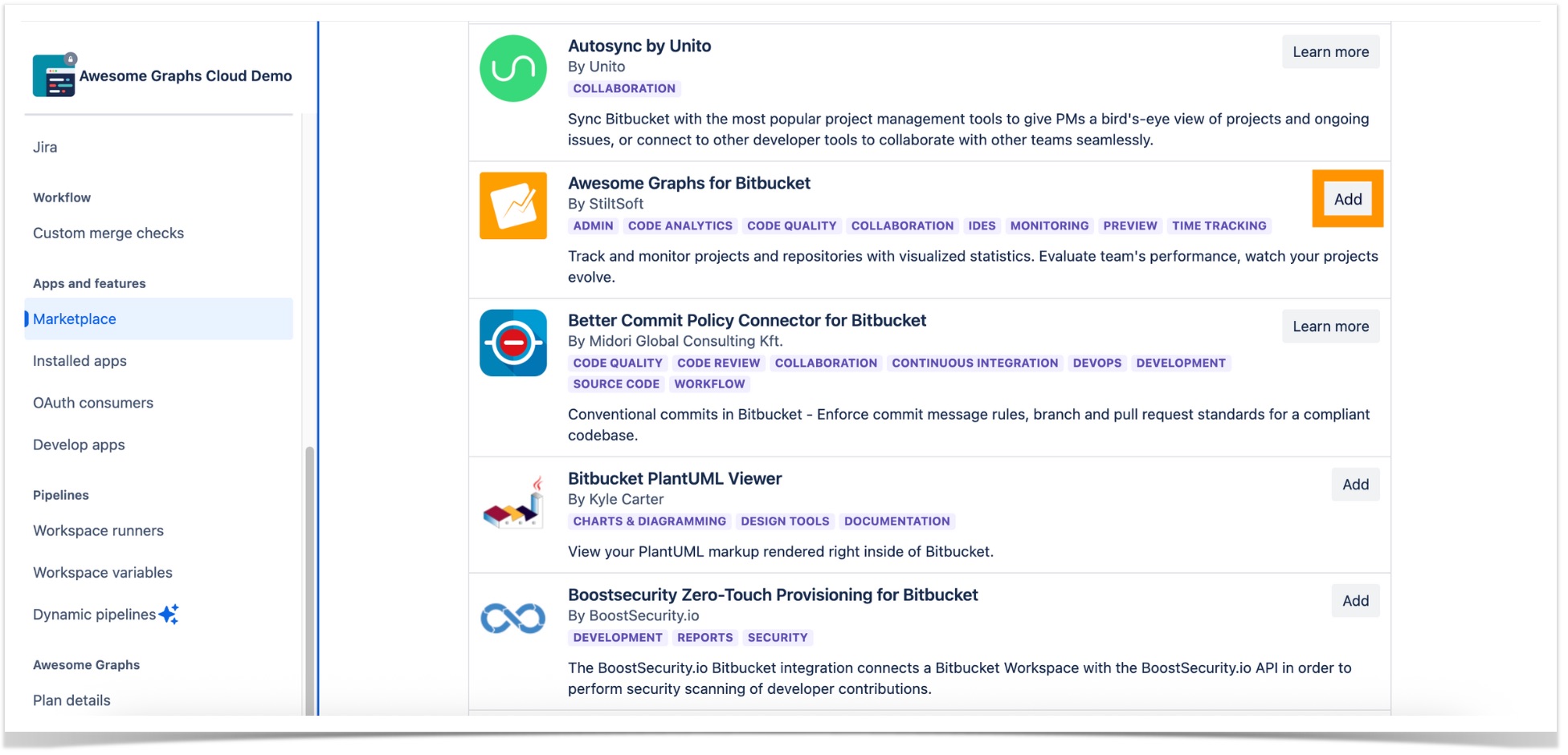 - Locate Awesome Graphs for Bitbucket in the list and click Add.