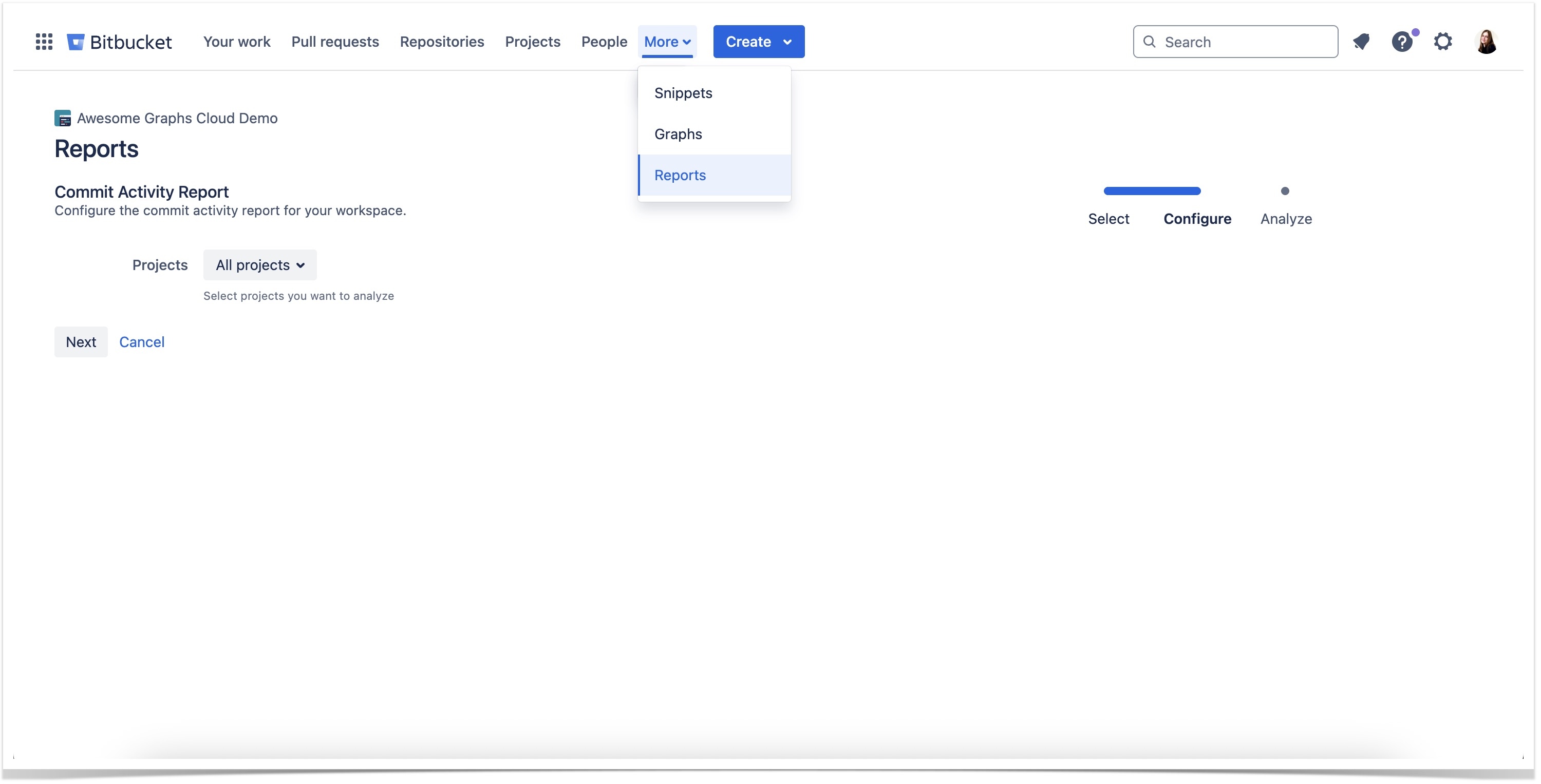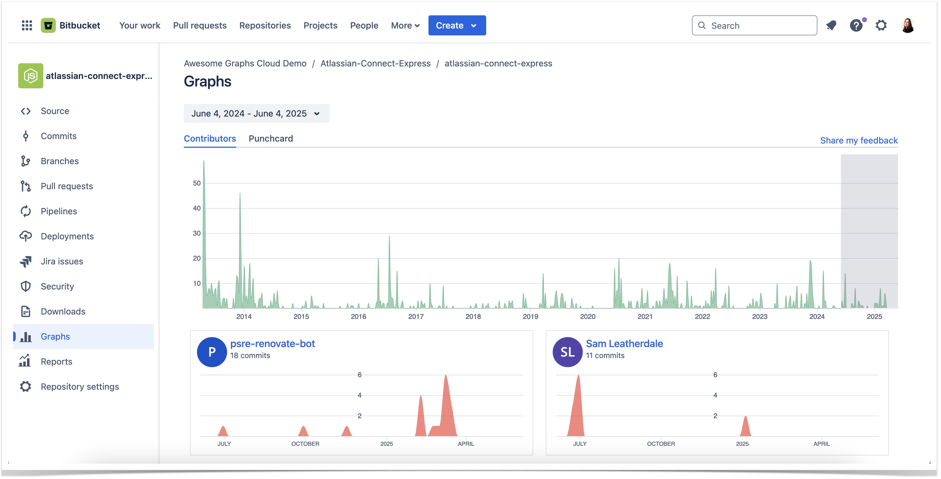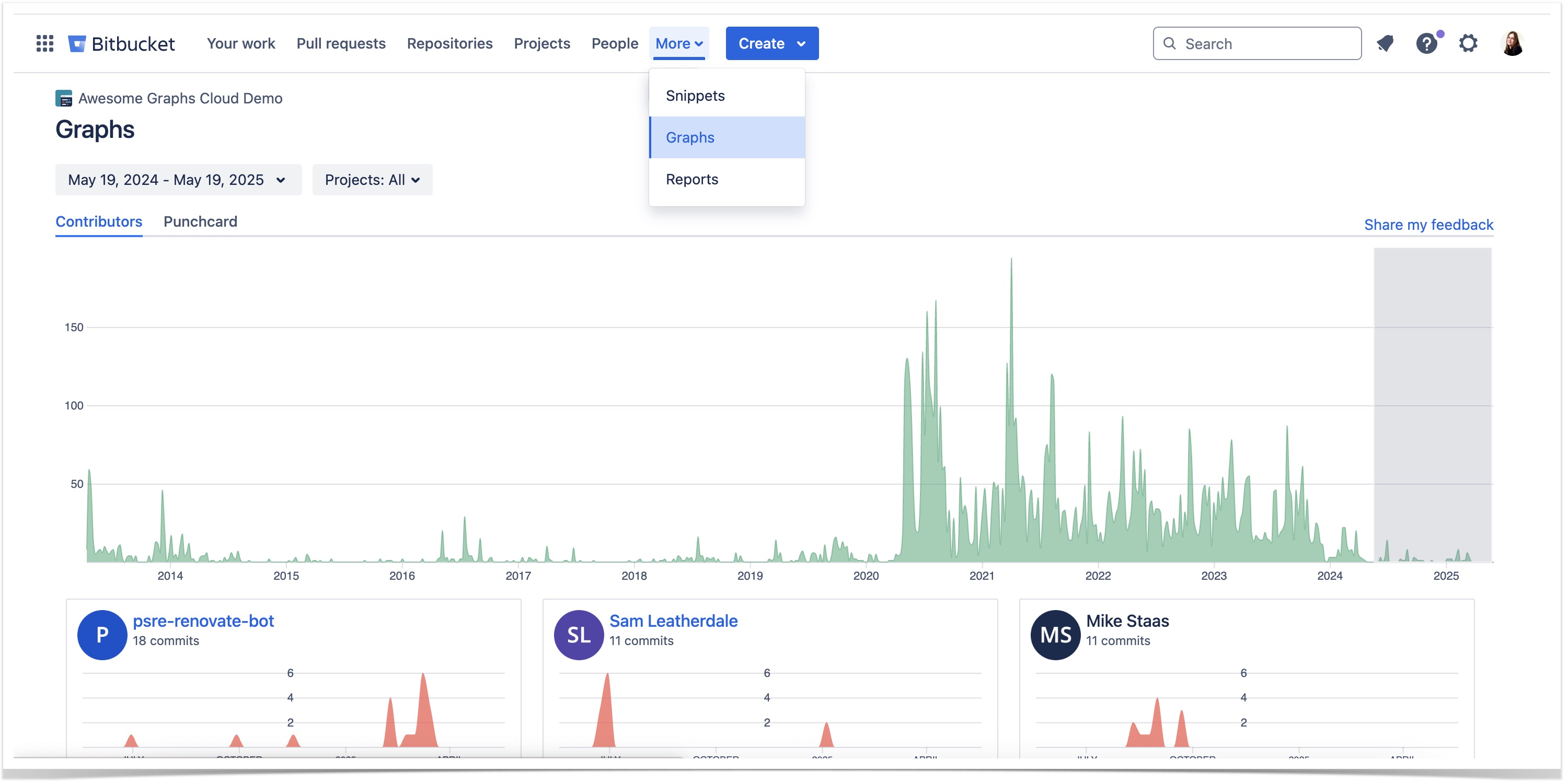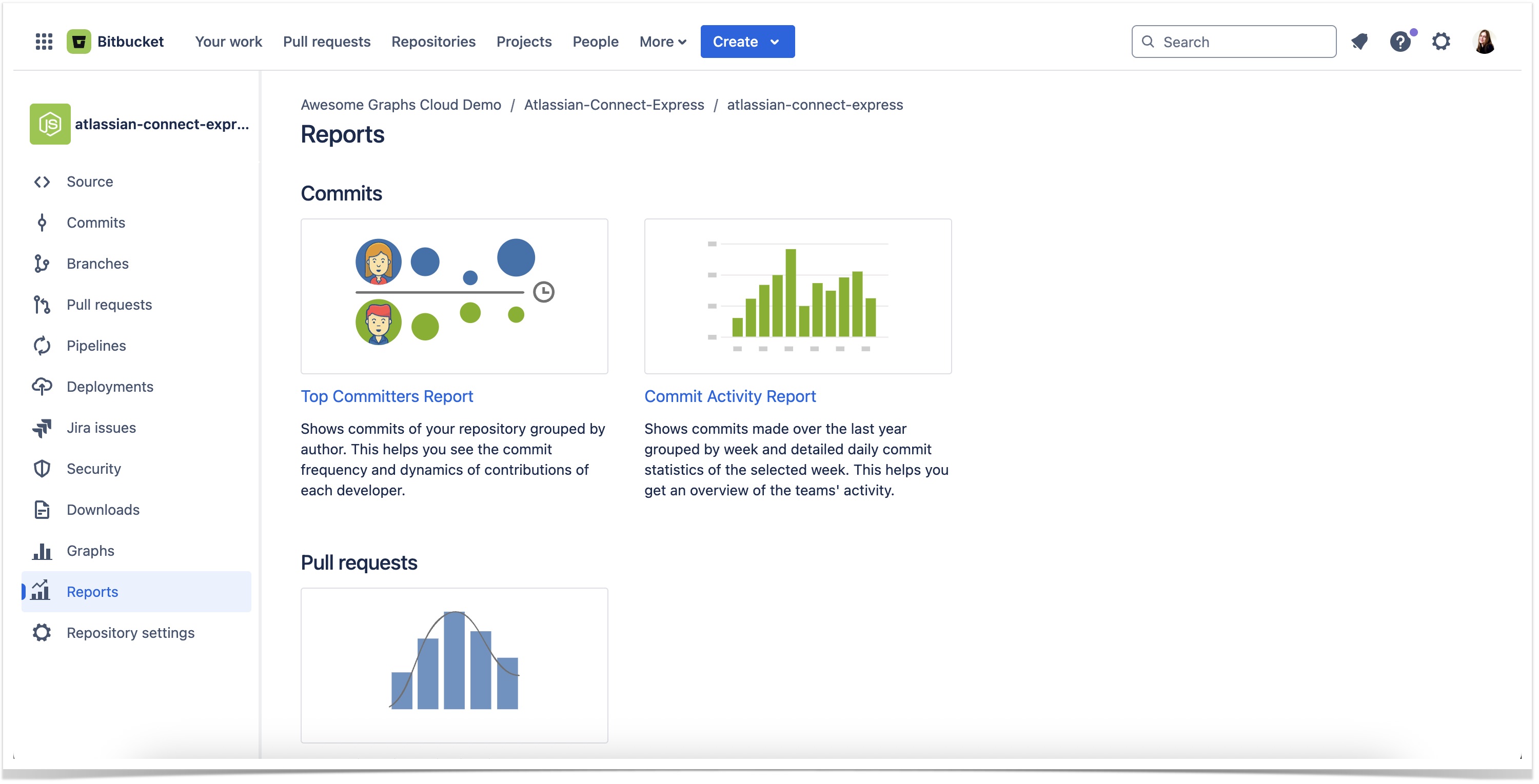 After the initial indexing is finished, you can use Awesome Graphs for Bitbucket to its full potential. The app provides you with a set of graphs and reports to analyze activity in your workspaces, projects, and repositories. You can learn more about each one on the Commits Analytics and Pull Request Analytics pages.