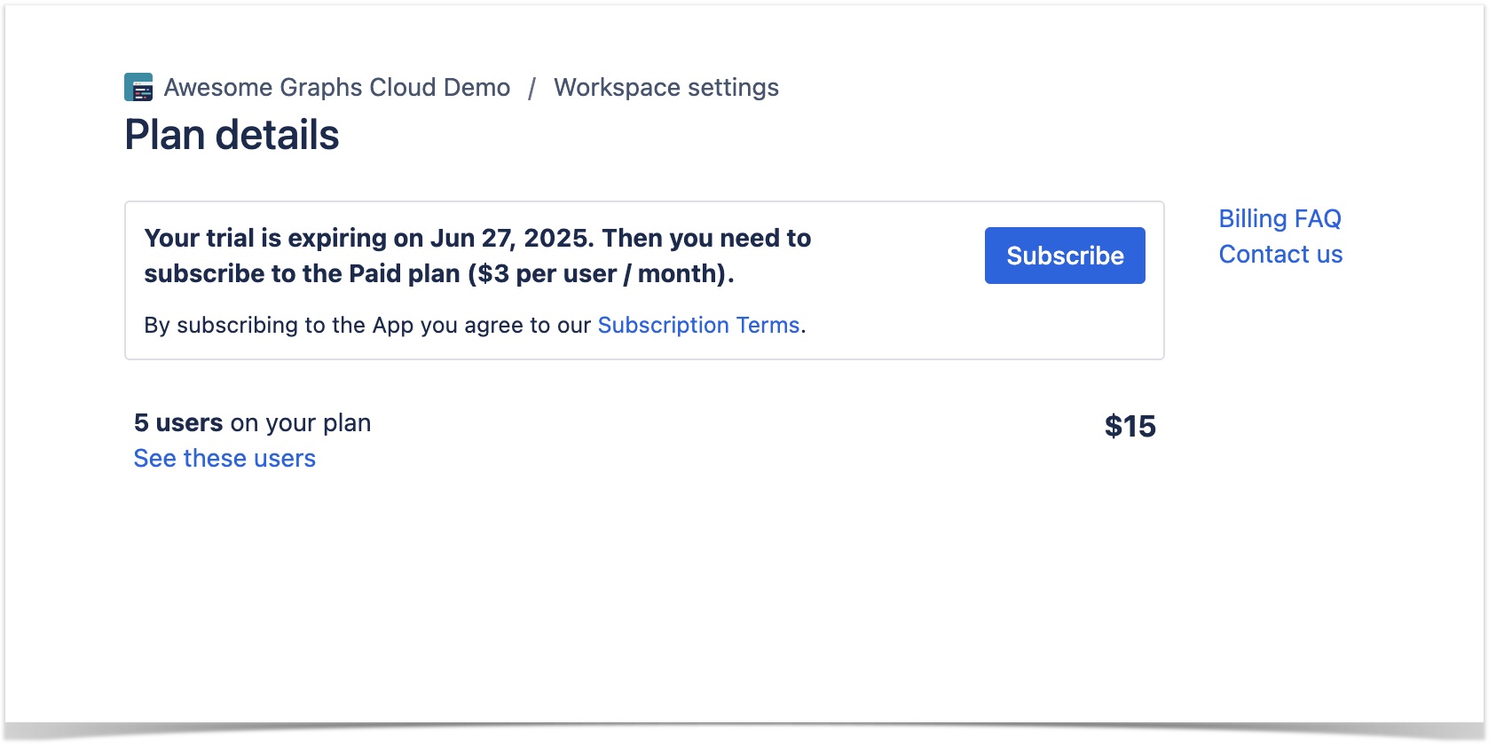 To make a purchase, navigate to Workspace settings - Awesome Graphs - Plan details.