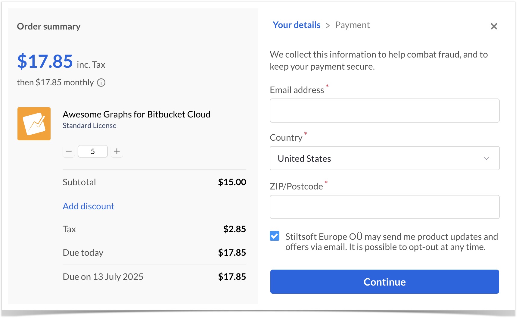 To continue using the app after your 14-day trial expires, you will need to purchase a license. Awesome Graphs is priced at $3 per user per month. The cost is applied to the total number of users who have access to your Bitbucket workspace.