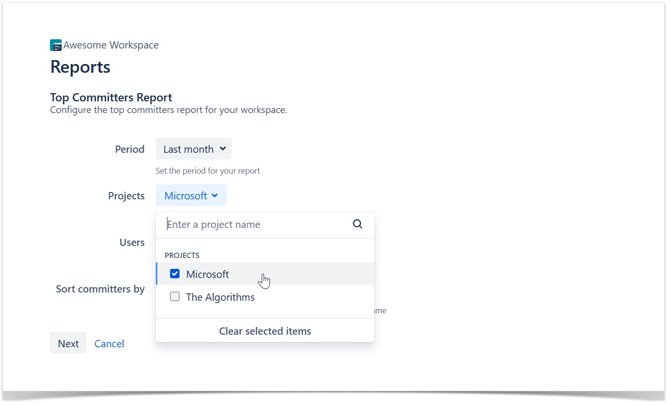 To generate reports for specific projects, you need to make your selection on the Reports Configuration page: