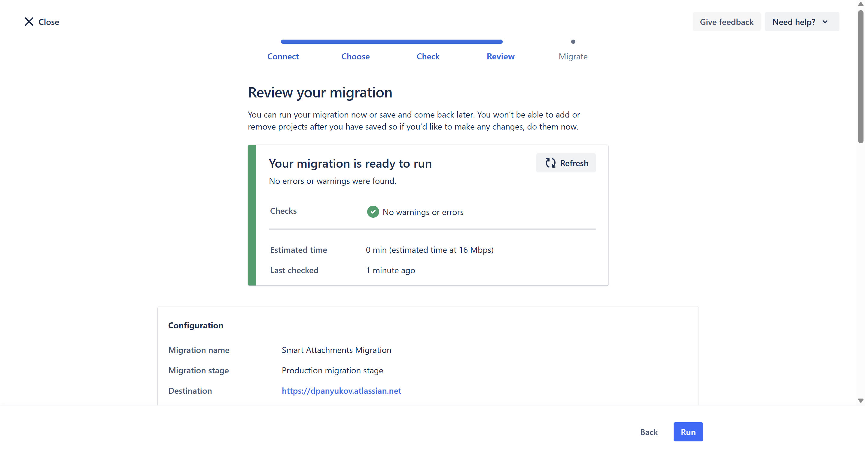 - Wait for the checks to complete. Evaluate errors and warnings. If everything looks good, click Review Migration