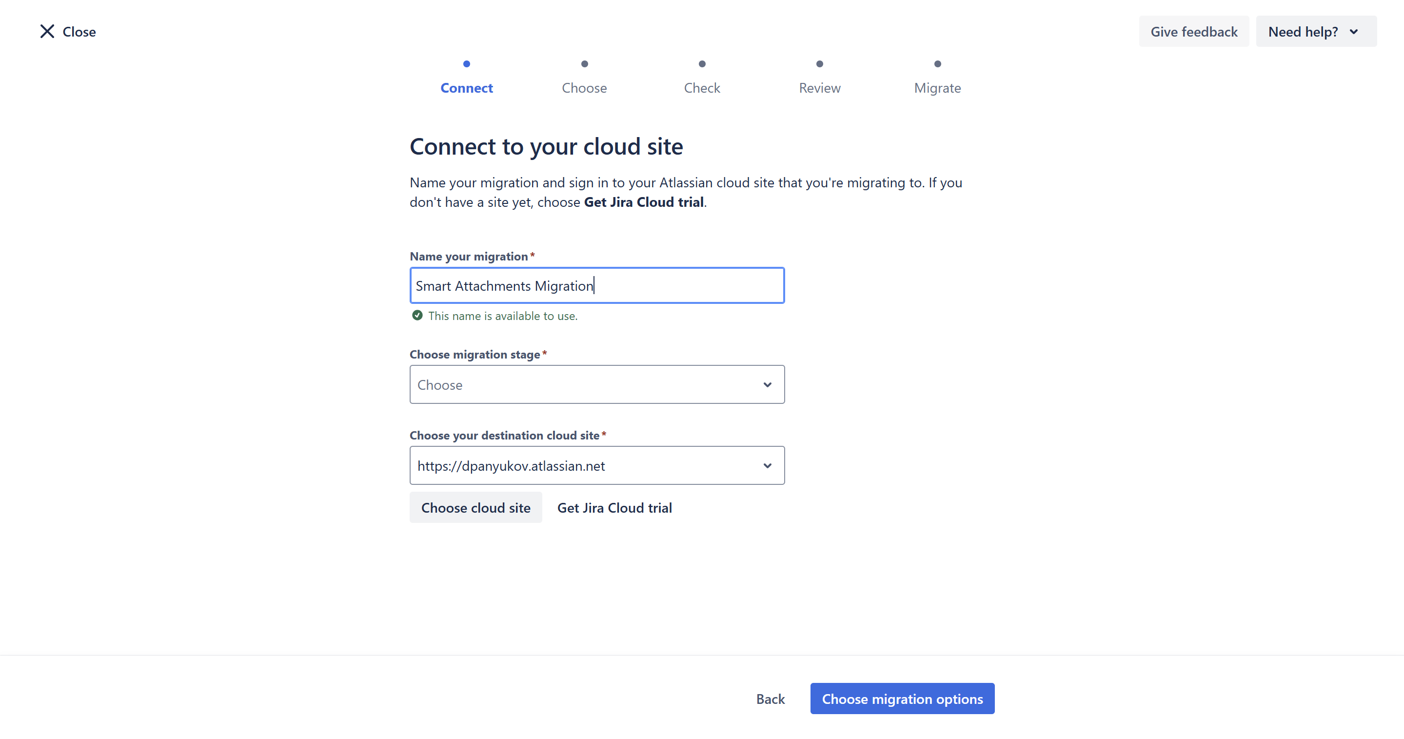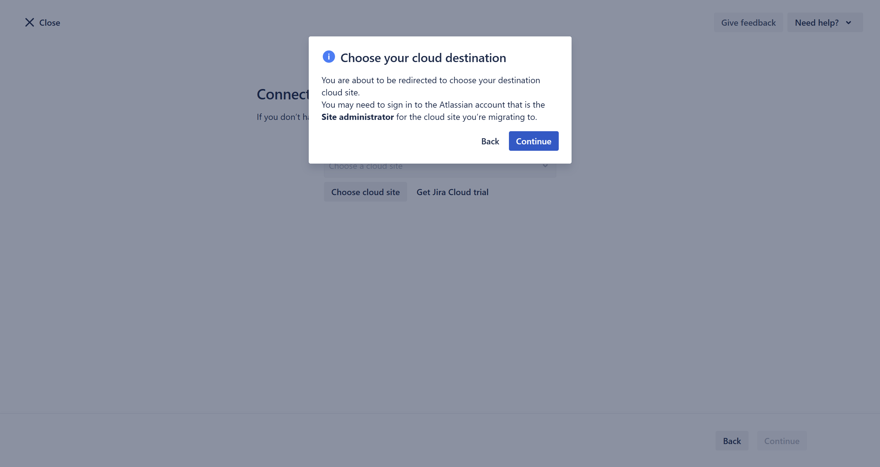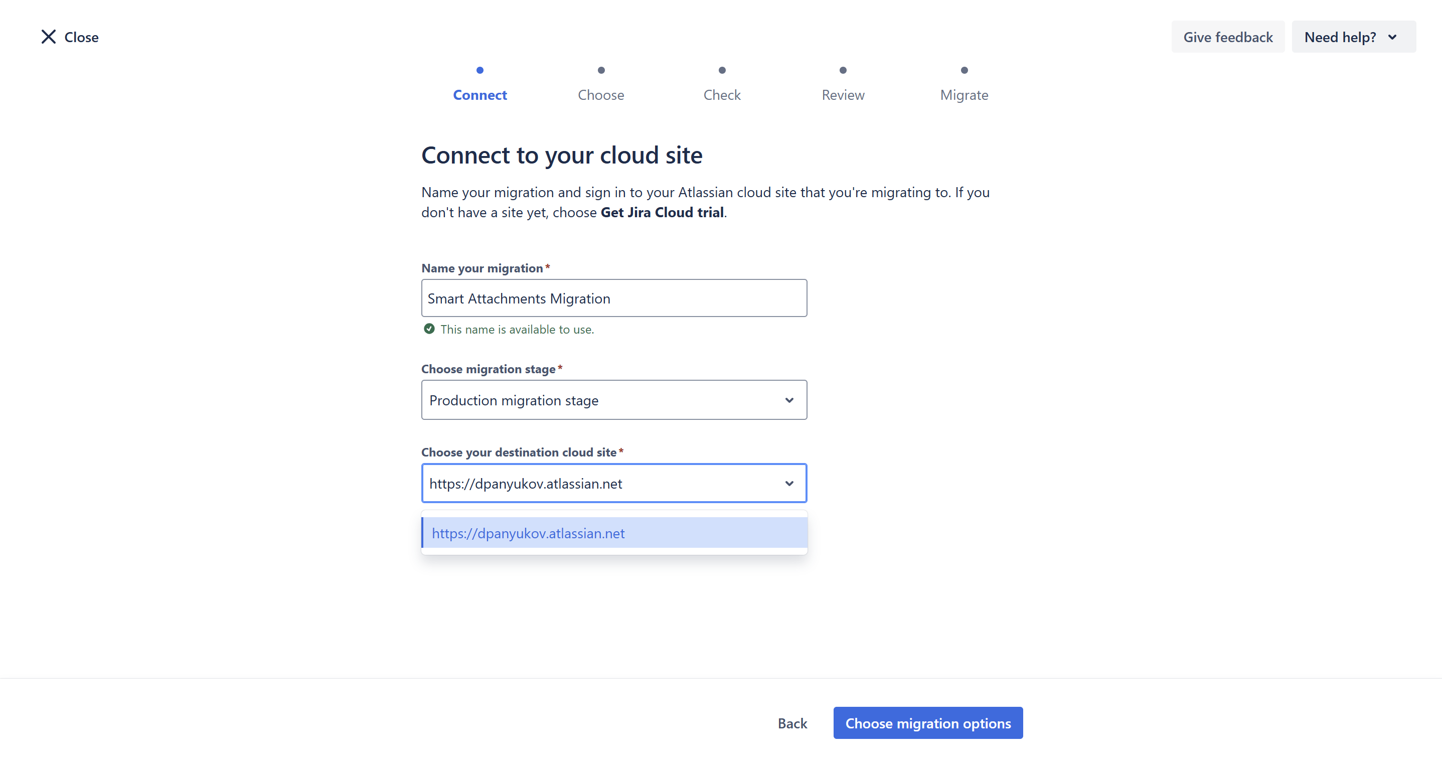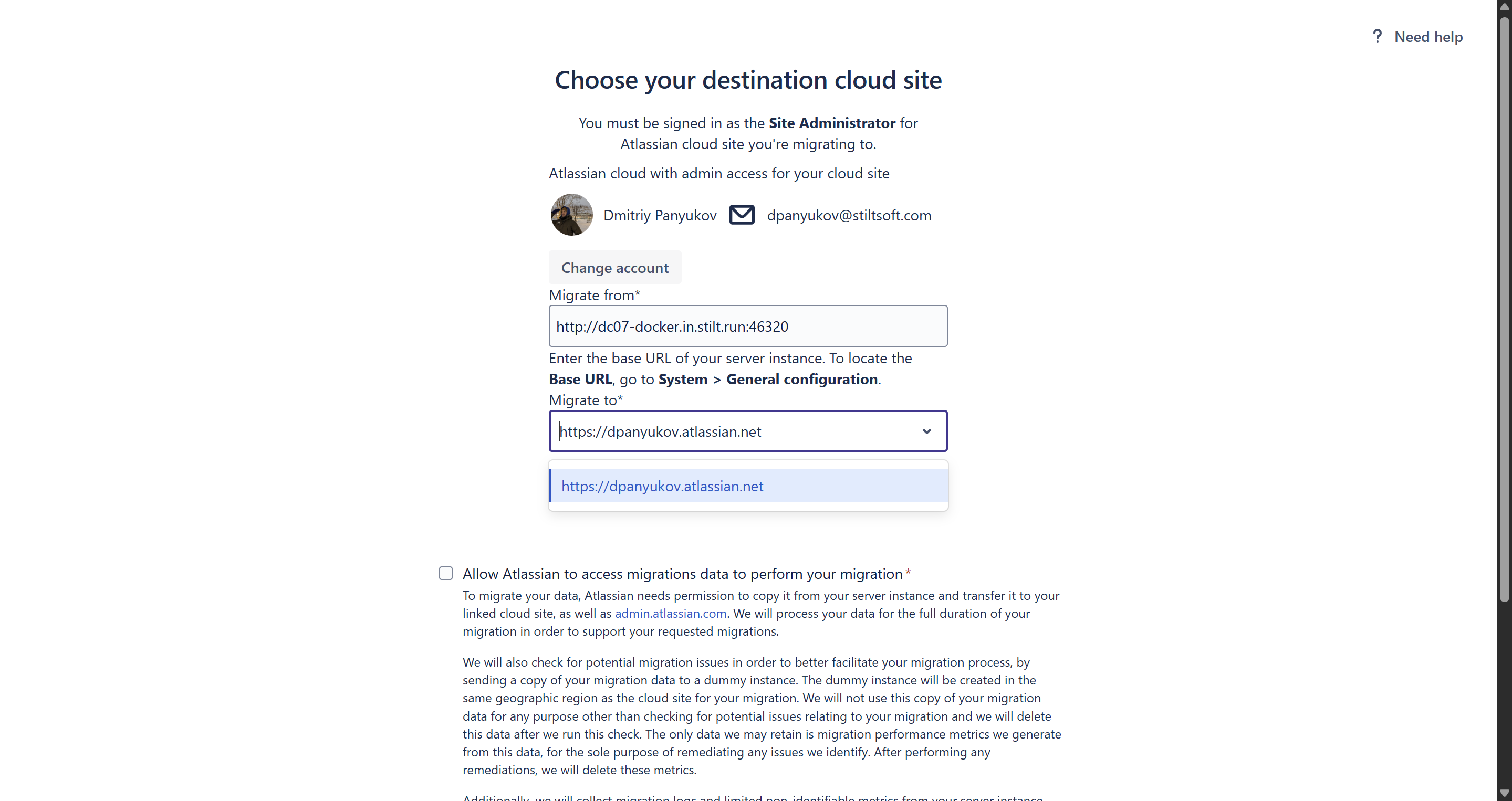 - In the Migrate from field, enter the base URL of your Server/Data Center instance.