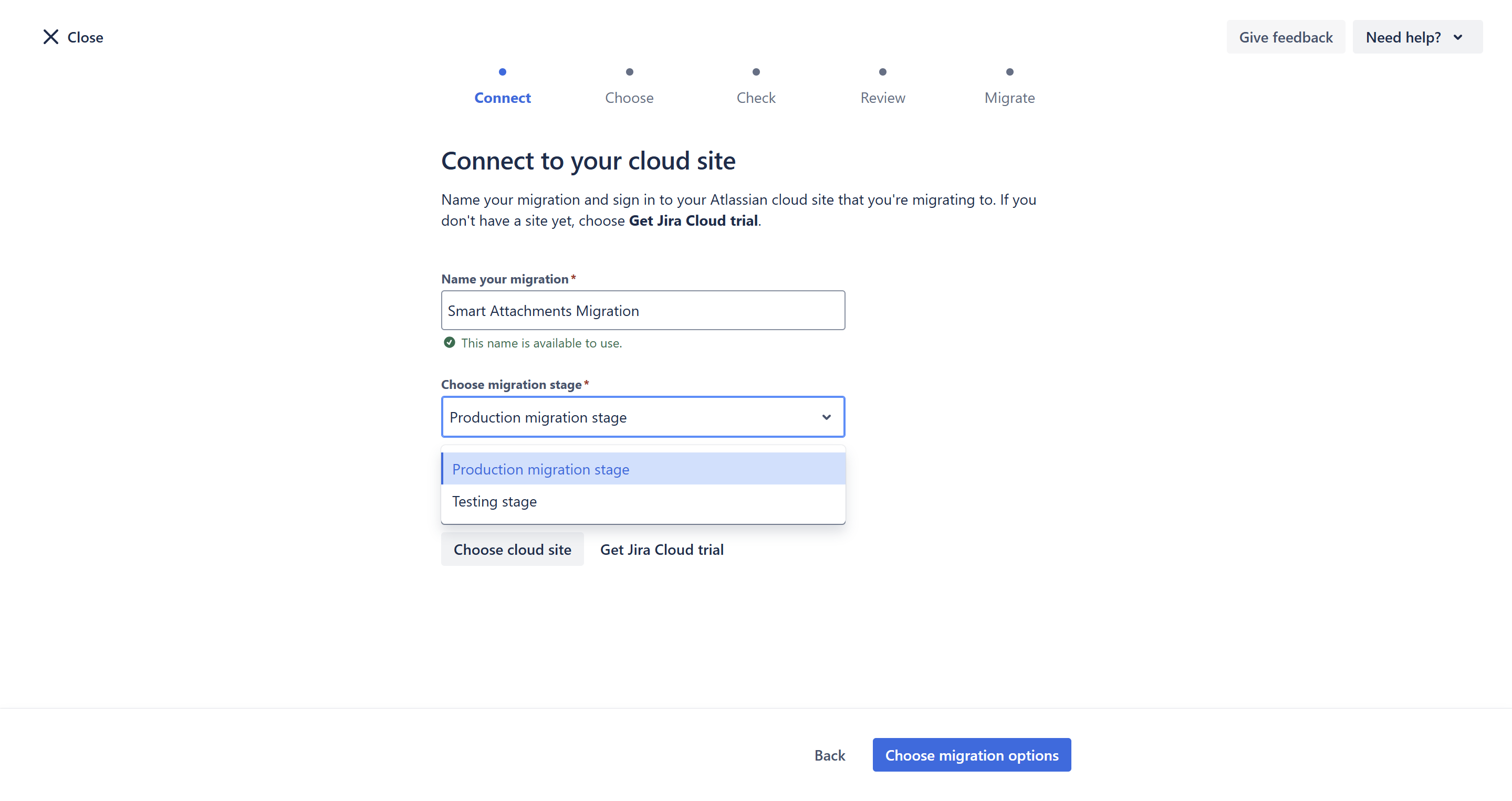 - Choose the migration stage.
