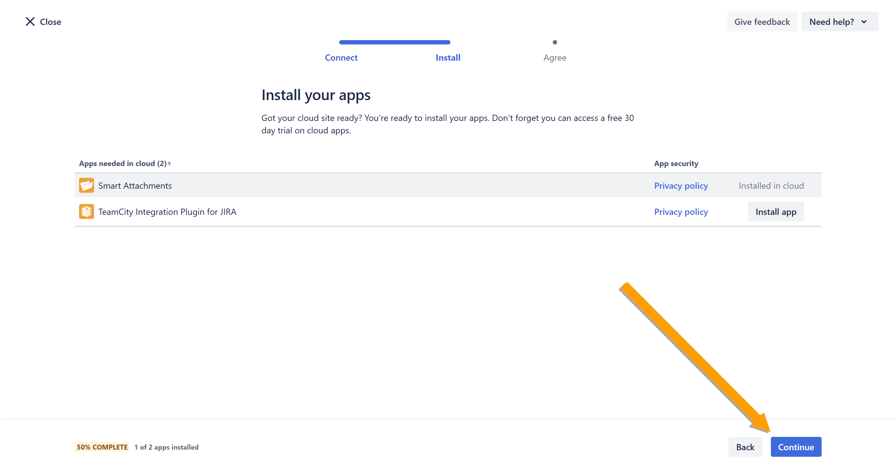 - If needed, install the app by clicking Install app. Once all apps are installed, click Continue.