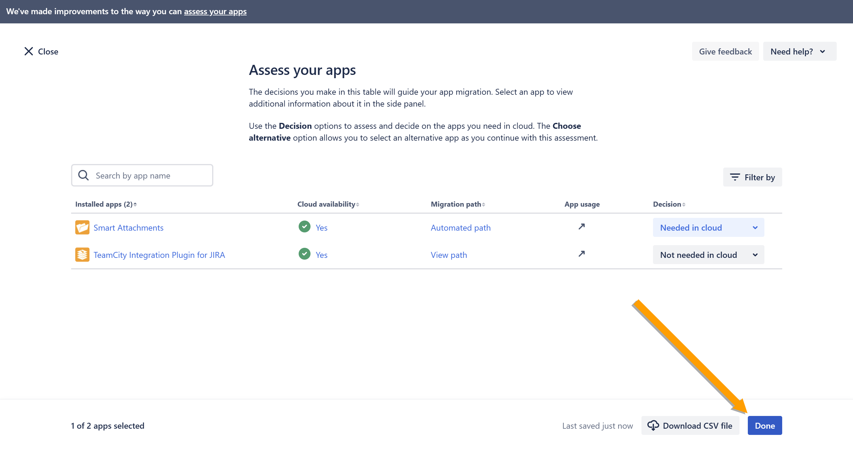 - On the Assess your apps page, select Needed in cloud for the Smart Attachments app. Choose the status for the rest of the apps if you plan to migrate multiple apps.