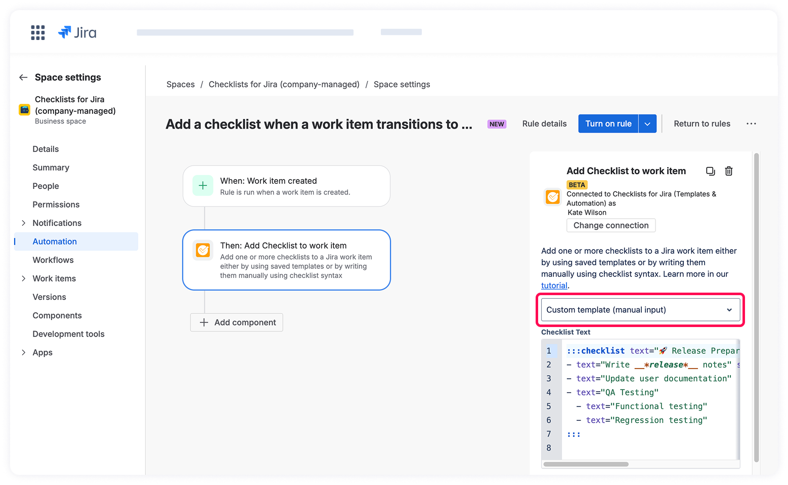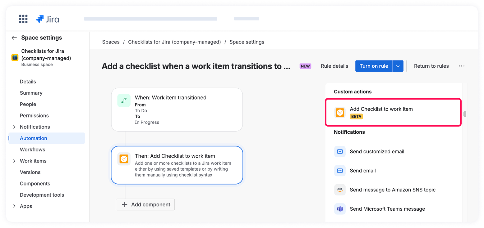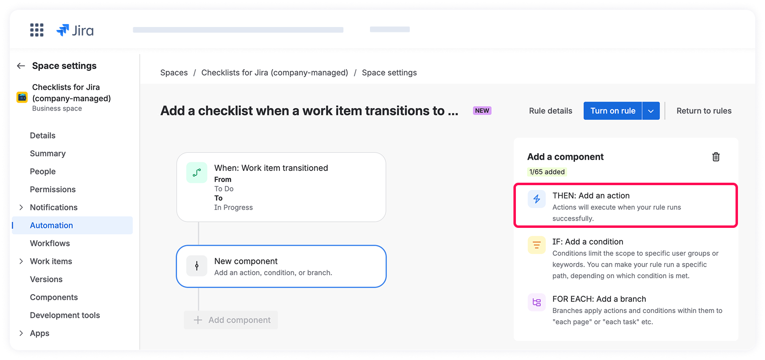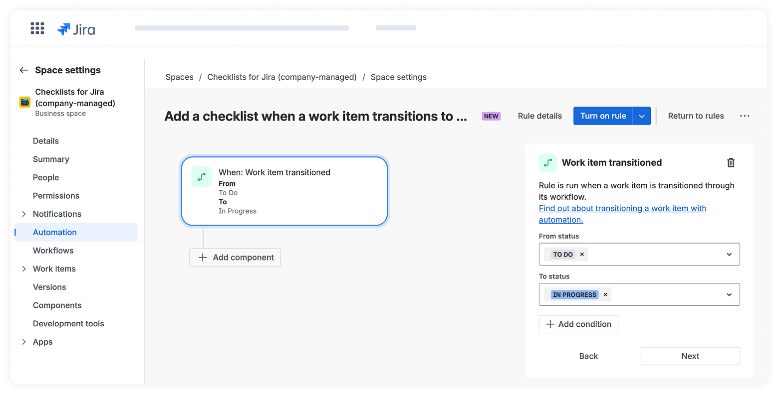 Use this rule when you want to add a checklist only after the issue reaches a particular status/stage (e.g. In progress, Ready for QA).