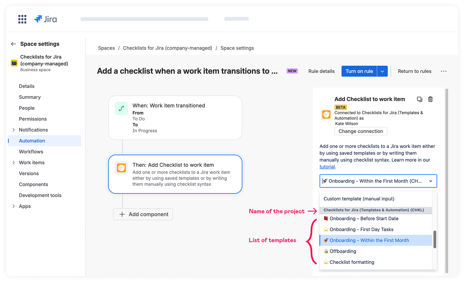 6. Select Add Checklist to work item from the list of components and connect Atlassian Automation to Checklists for Jira (Templates & Automation).