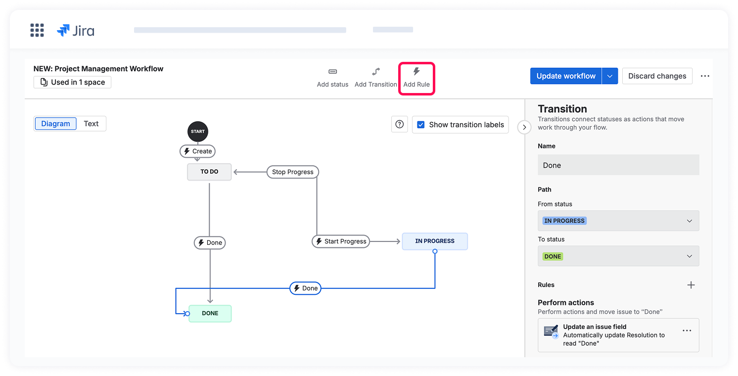 1. Select the transition (arrowed line) where you want to add the validator, and click Add rule.