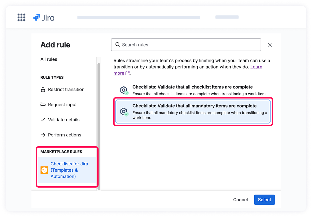 2. In the configuration screen, click Checklists for Jira (Templates & Automation) under Marketplace Rules.