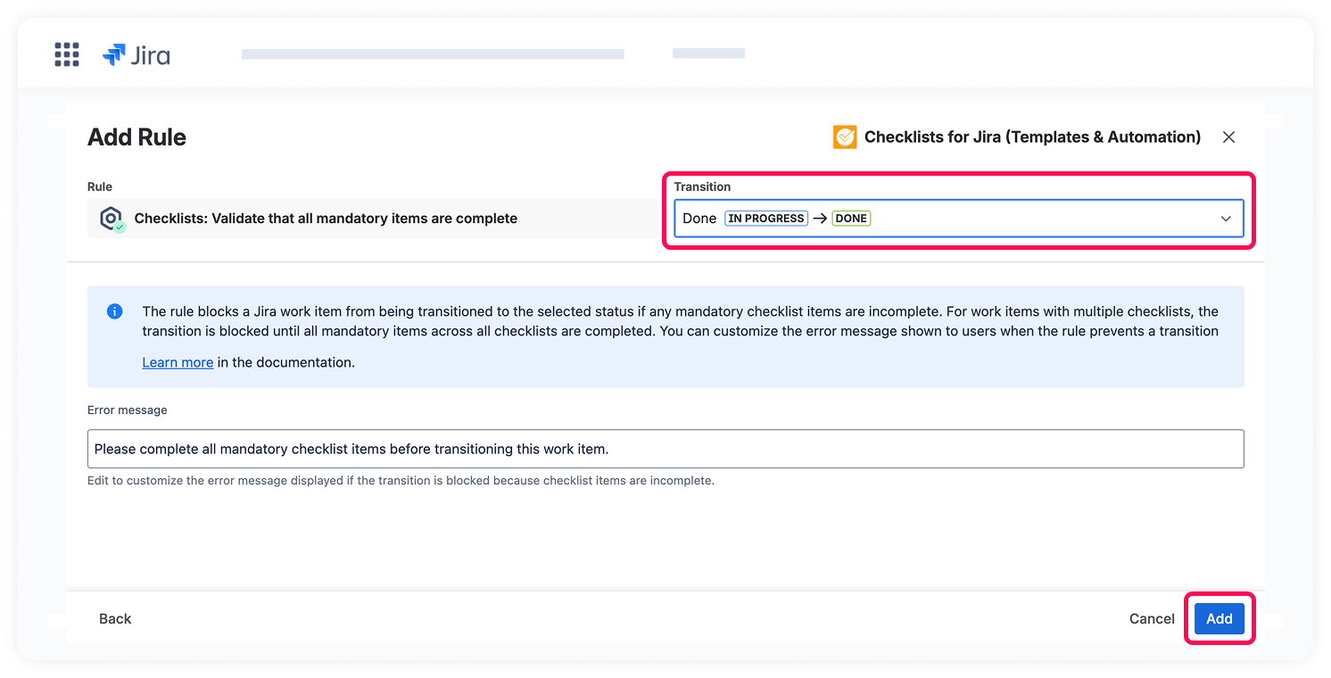 Ensure that all required checklist items are completed before a work item can be transitioned to a specific status. This workflow validator enforces compliance with required checklist items by blocking work items from progressing until all mandatory steps are completed.