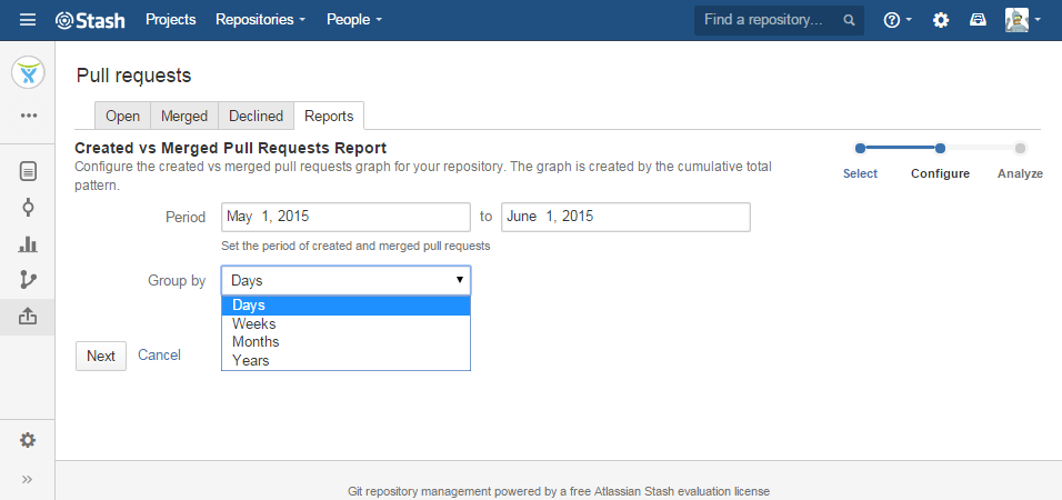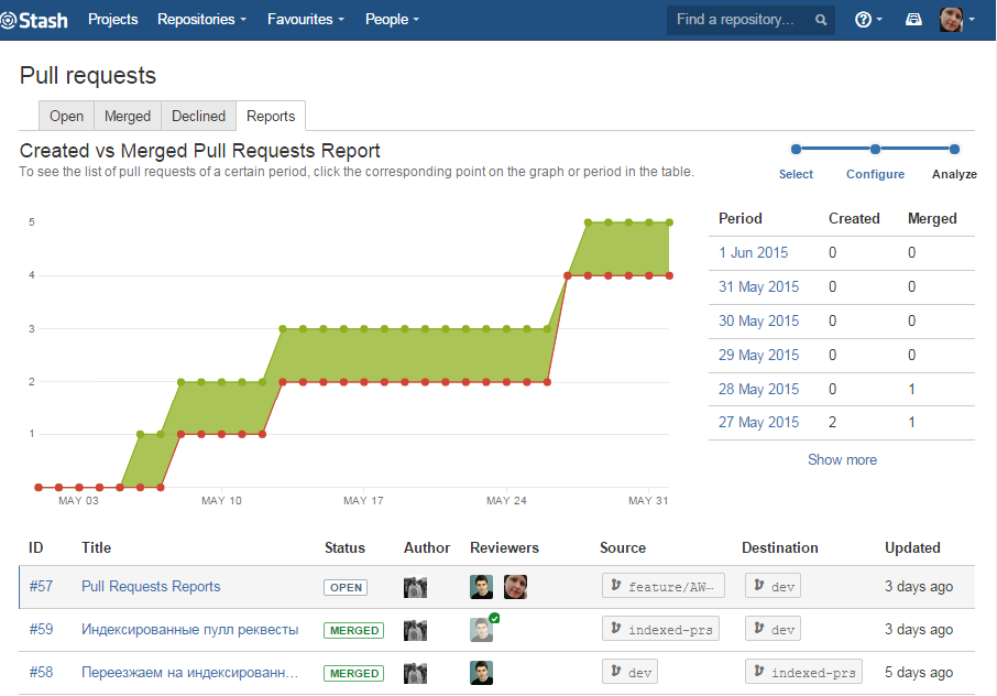 2. Choose Pull requests> Reports> Created vs Merged Pull Requests Report.