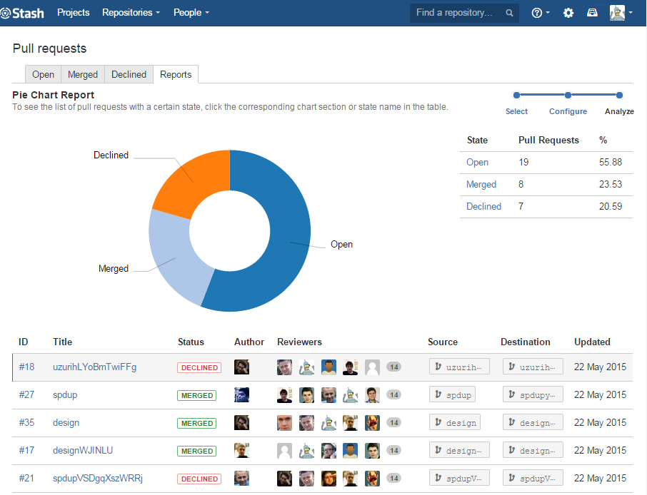 • View and analyze the breakdown of all pull requests in a repository grouped by author, reviewer, state or destination branch.