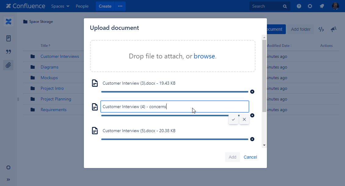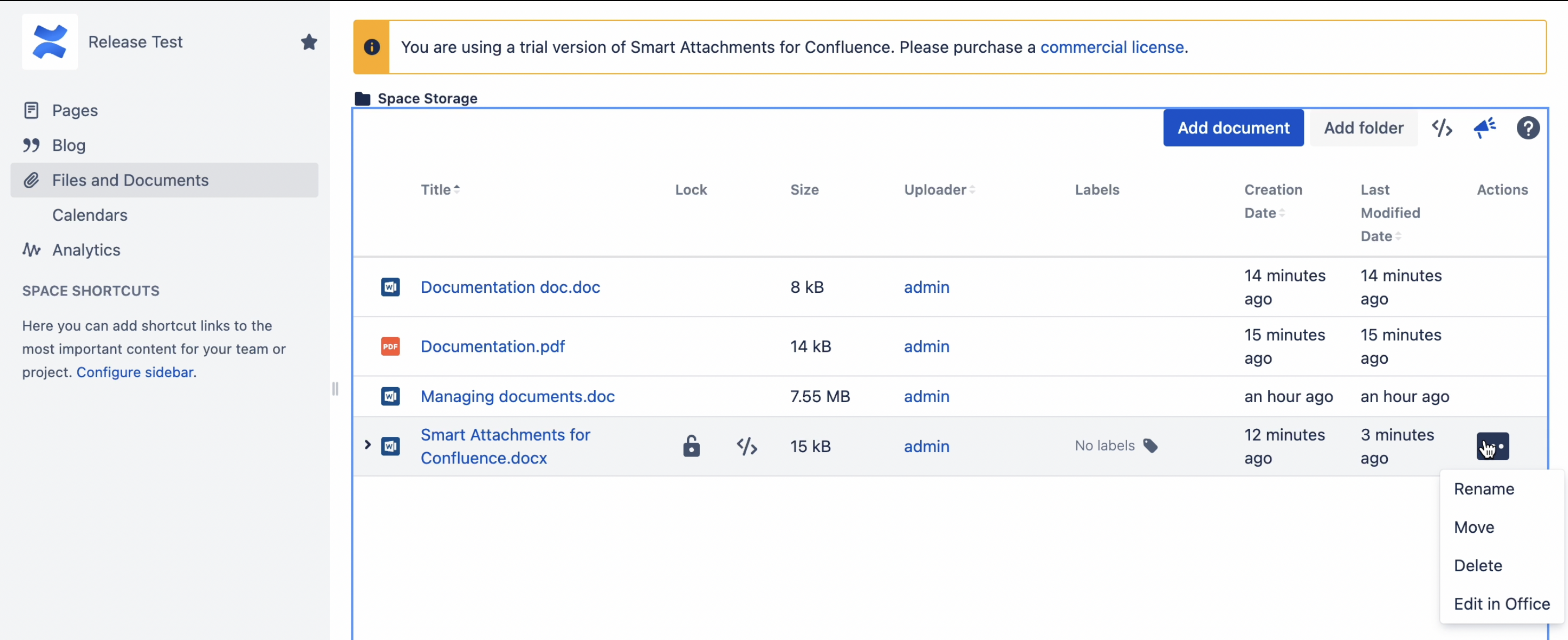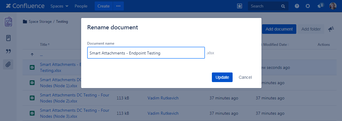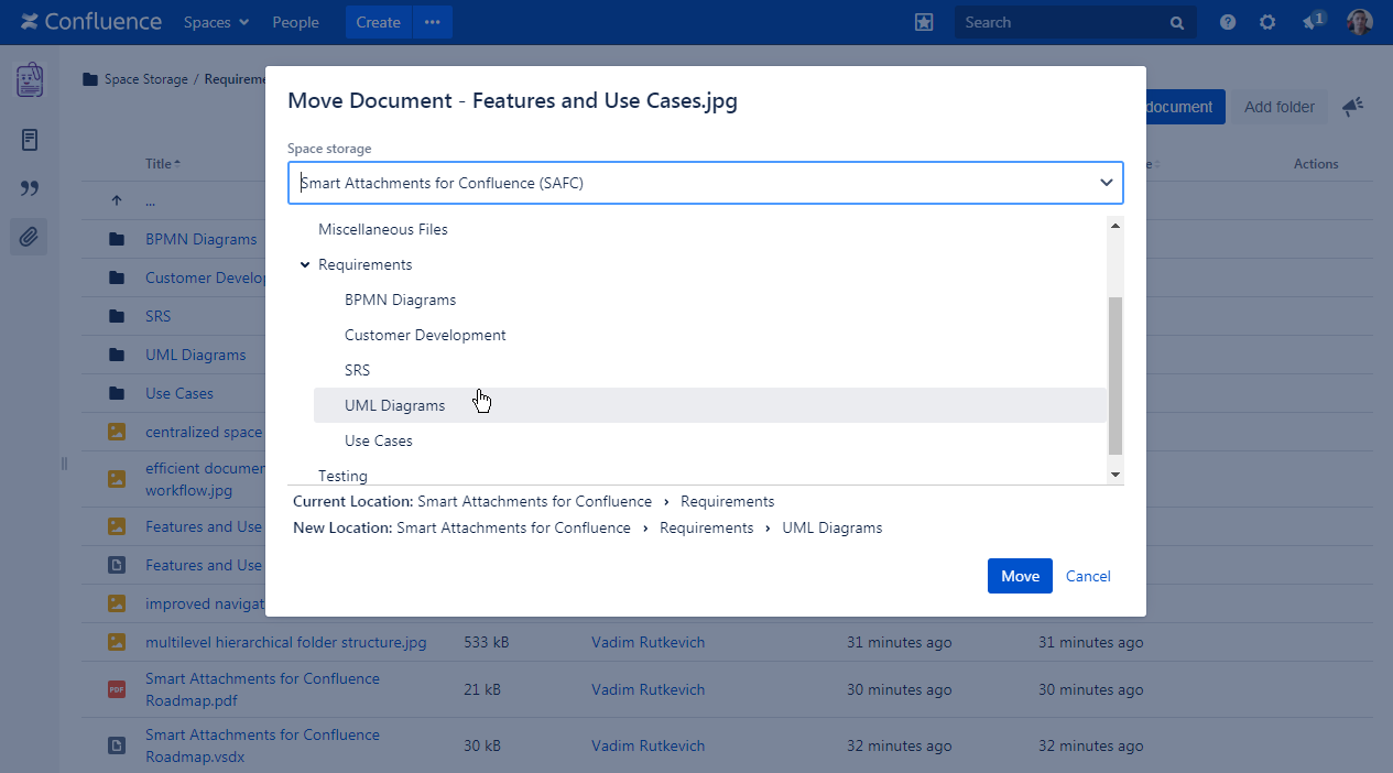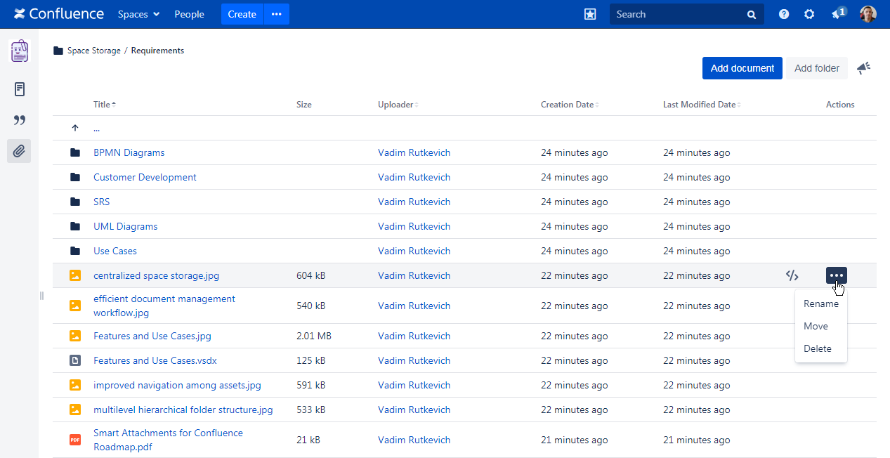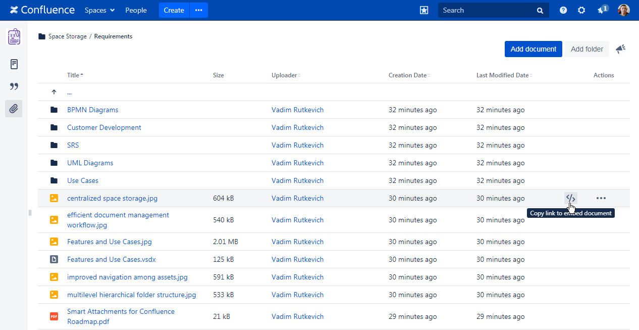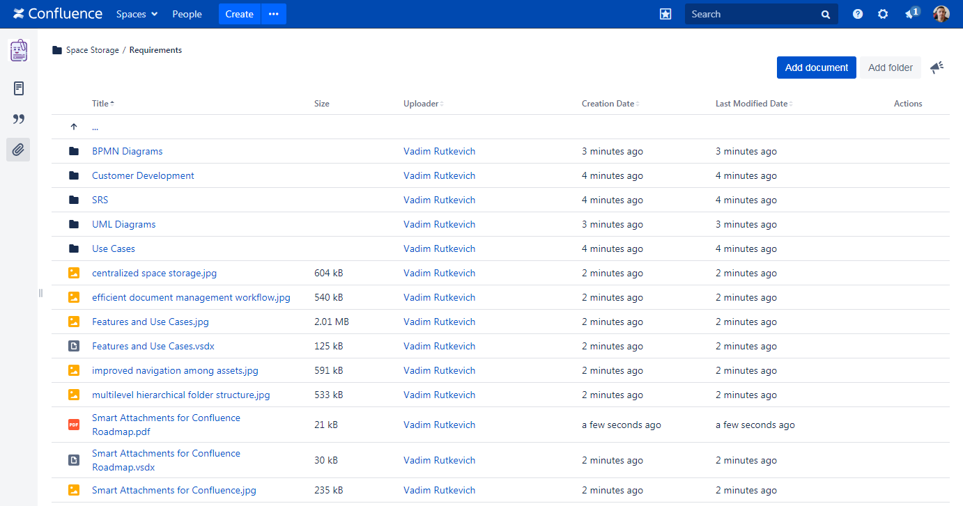 Smart Attachments is a document management app for Confluence. It allows you to manage documents and store them in folders with Confluence spaces. Here your teammates can quickly access these documents and get the latest document revisions in no time. Now you needn't worry that your project files are distributed through Confluence pages in a total mess.