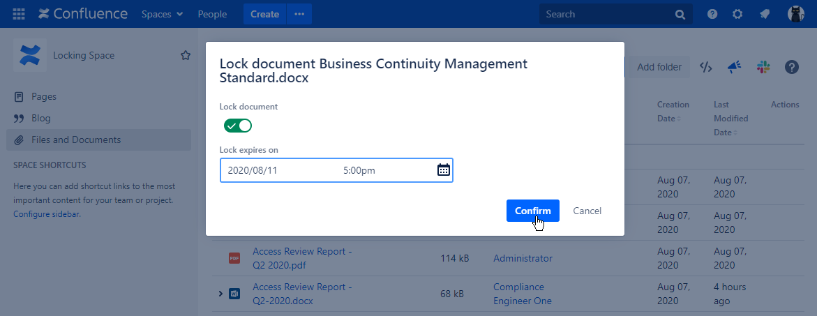 Users from the confluence-administrators group can forcedly unlock the locked documents if needed.
