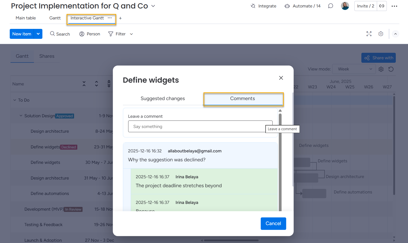 Alternatively, a project manager can initiate a discussion directly in the Interactive Gantt Timeline view.