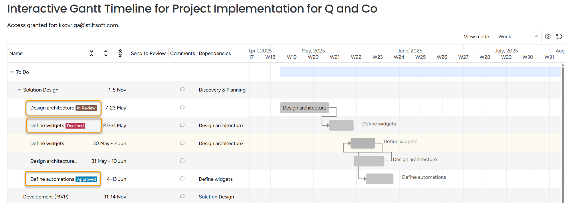 The item is marked as In review on the Gantt.