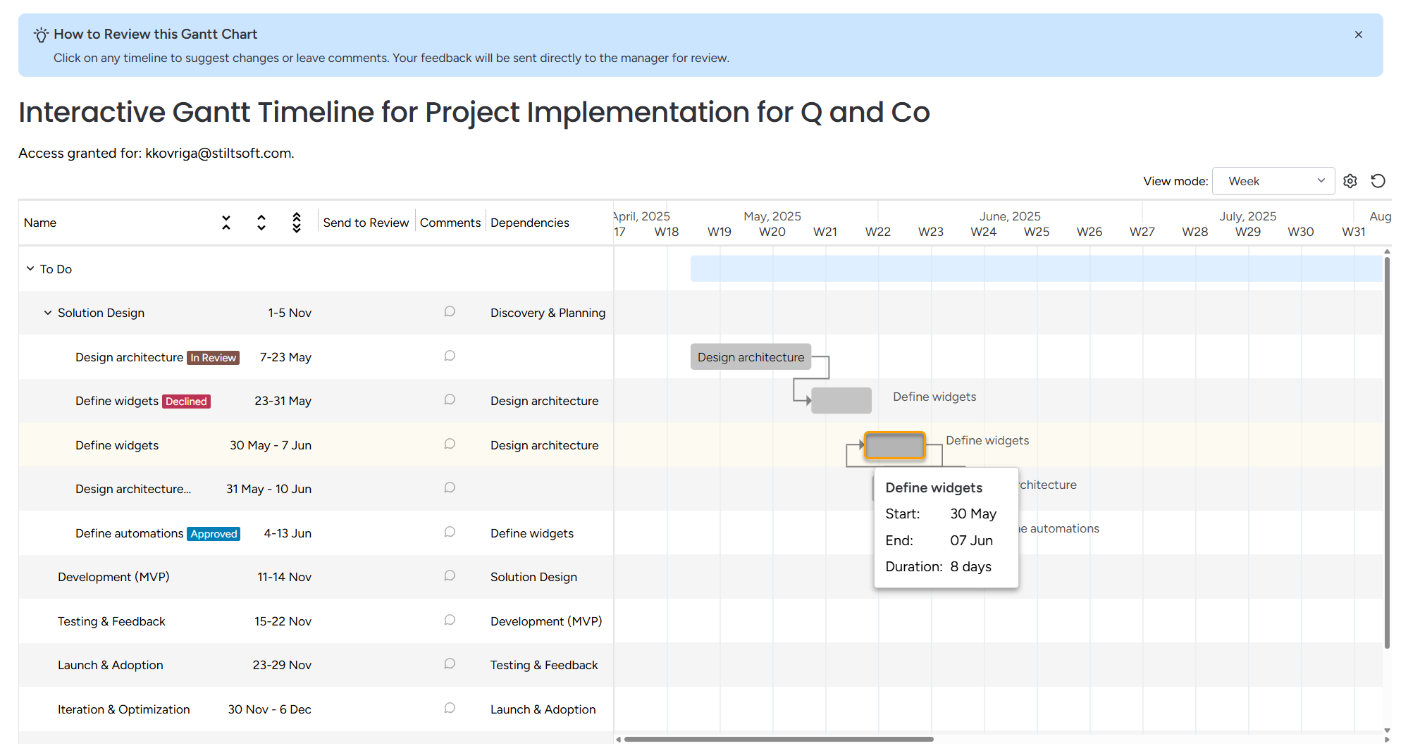 To propose a new schedule, the client simply clicks any timeline bar in the chart.