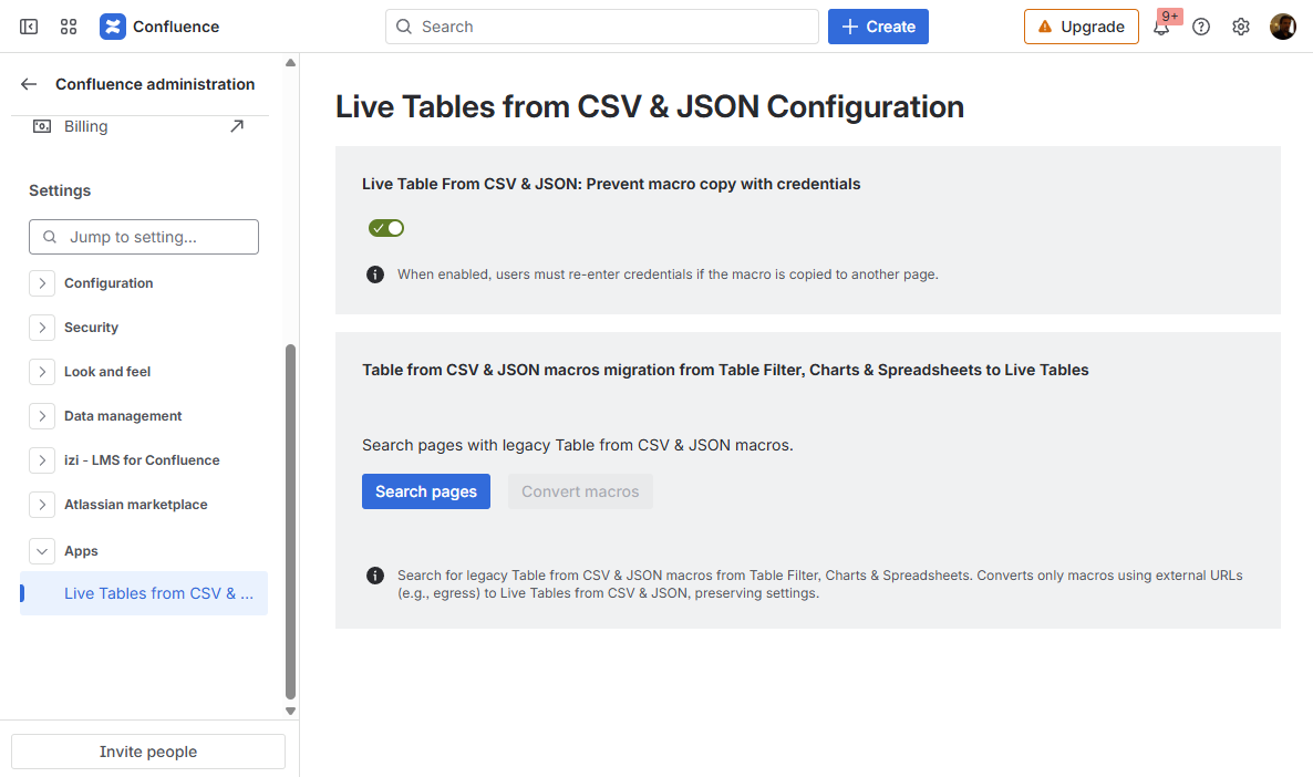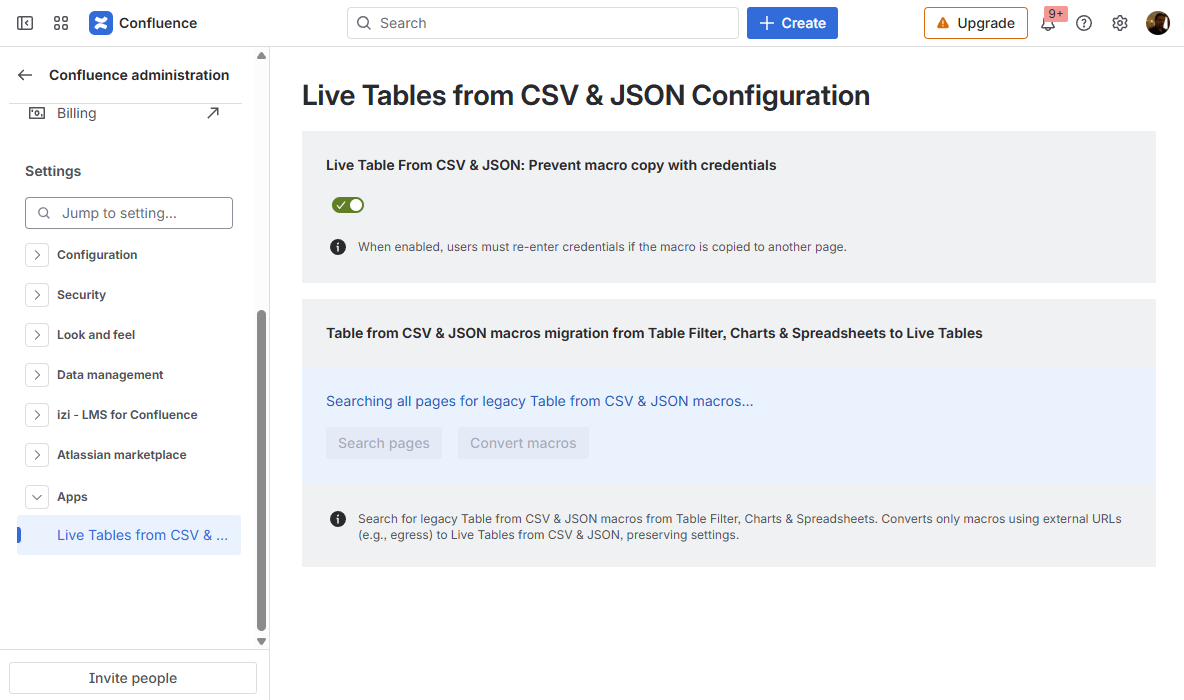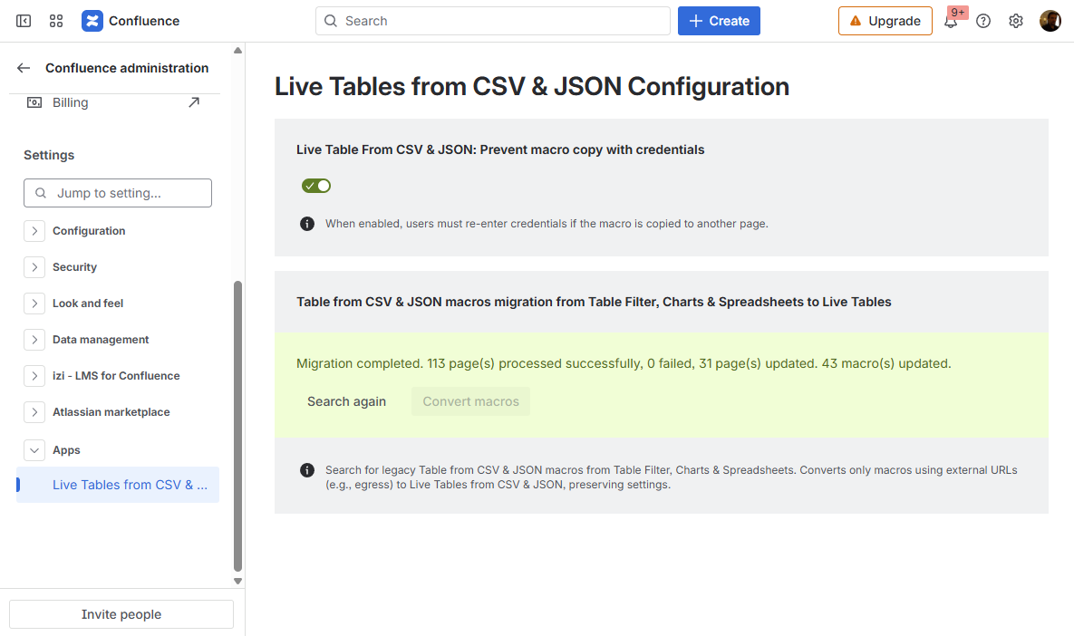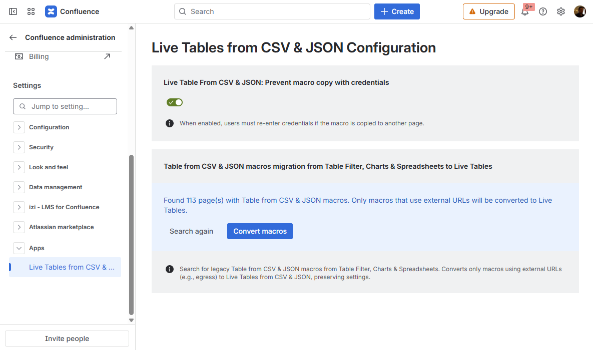 Live Tables from CSV & JSON for Confluence Current: Configuring parameters of Live Tables from CSV & JSON PDF Download PDF Download page Configuring parameters of Live Tables from CSV & JSON. Current page All pages Configuring parameters of Live Tables from CSV & JSON How to configure the app settingsGo to Confluence Administration Open the Apps section on the leftChoose Live Tables from CSV & JSON Configuration How to prevent credentials copying in Live Table from CSV and Live Table from JSON macrosWhen the Live Table from CSV & JSON: Prevent macro copy with credentials option is enabled, users must re-enter credentials if the macro is copied to another page.Go to Live Tables from CSV & JSON ConfigurationToggle on or off the Live Table From CSV & JSON: Prevent macro copy with credentials setting How to migrate Table from CSV & JSON macros from Table Filter, Charts & Spreadsheets to Live Tables from CSV & JSON macrosTable from CSV and Table from JSON macros are restricted from fetching data from external URLs because of the Table Filter, Charts & Spreadsheets app migration to the Forge platform, and the Runs on Atlassian requirement. Live Tables from CSV & JSON macros are here to overcome this limitation and fetch data from external URLs.Migrate Table from CSV and Table from JSON macros configured to fetch data from external URLs in older versions of the Table Filter, Charts & Spreadsheets app to the Live Tables from CSV & JSON macros to keep it working with no need to recreate macros from scratch:Go to Live Tables from CSV & JSON ConfigurationClick the Search pages button and wait until it finds all pages with Table from CSV and Table from JSON macrosClick the Convert macros button and wait until all Table from CSV and Table from JSON macros configured to fetch data from external URLs are converted to Live Tables from CSV & JSON macros After migrating macros with configured authentication, you will need to re-enter credentials in the macro configuration. ×