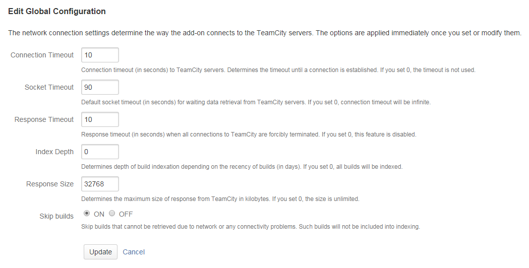 Once the app has established the connection, it starts waiting for data fetching from TeamCity. Socket timeout is amount time the app waits for completion of packet data retrieval from TeamCity instance before it terminates the session. The higher value you set, the longer the app will wait during transfer of sequential data packets.