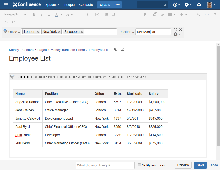 Table Filter and Charts for Confluence add-on allows you to filter your table data while you are editing it on the page. You can manage all the necessary filters while working with table data and filter it on the fly.