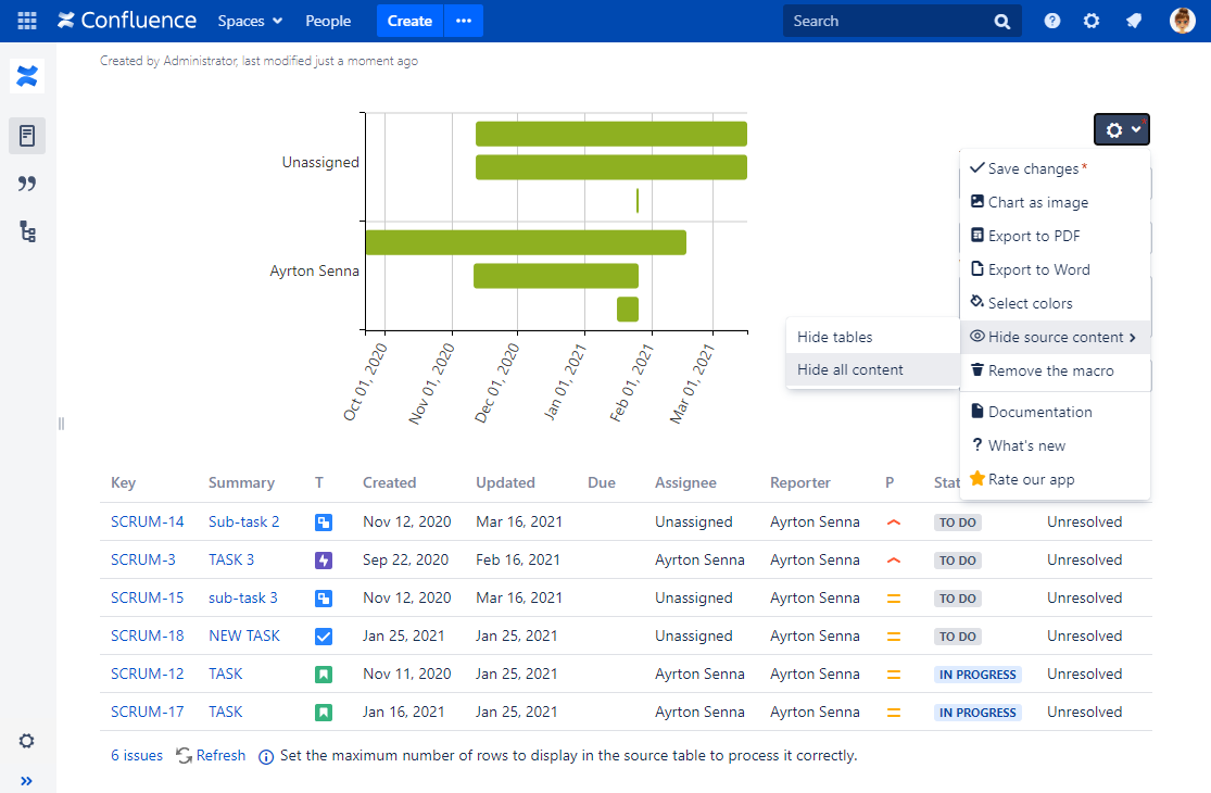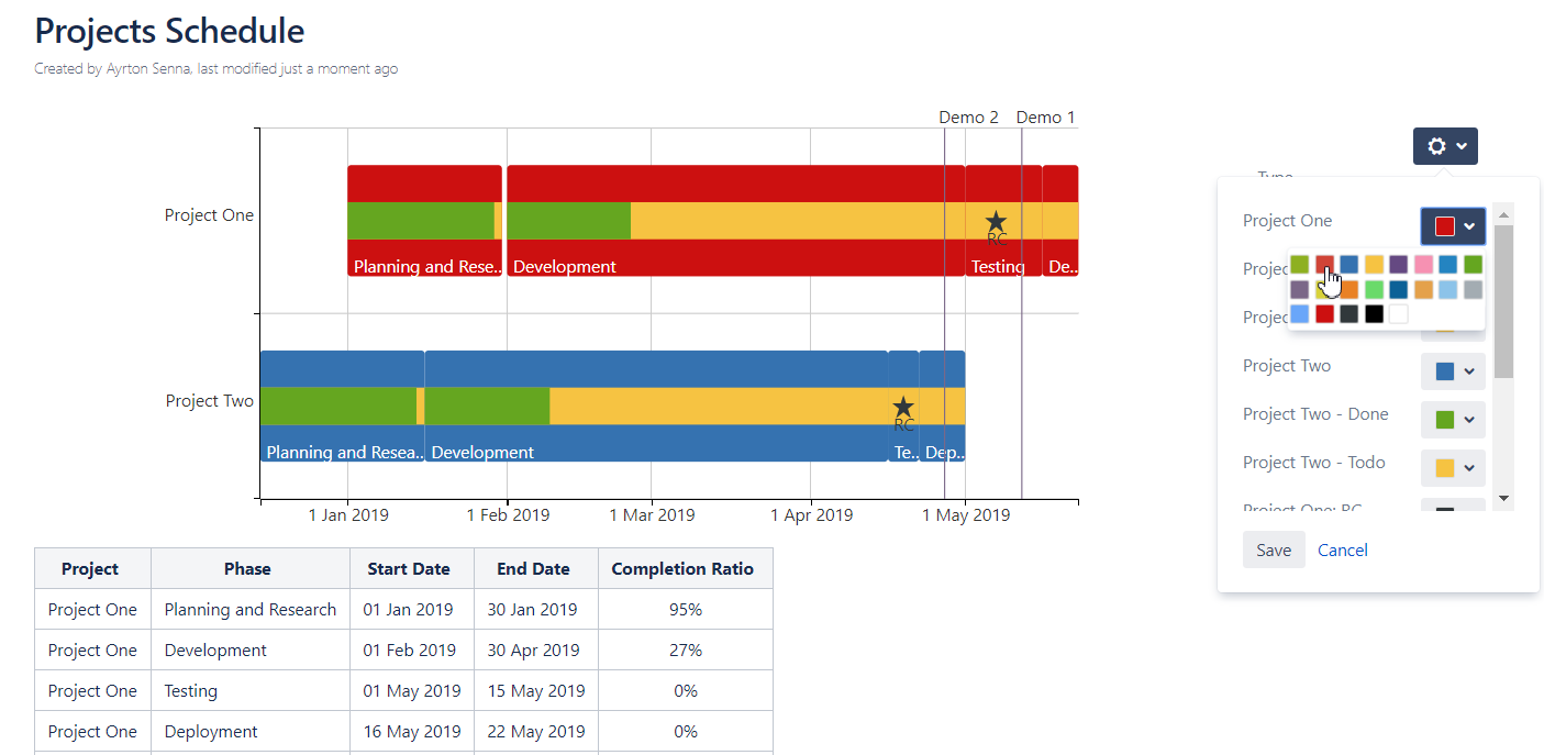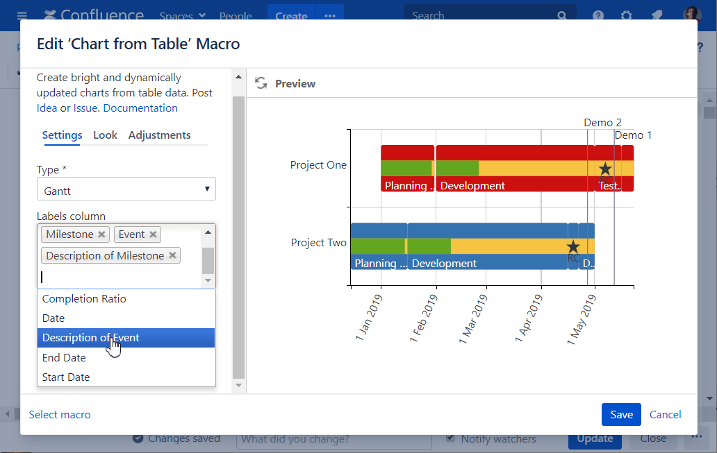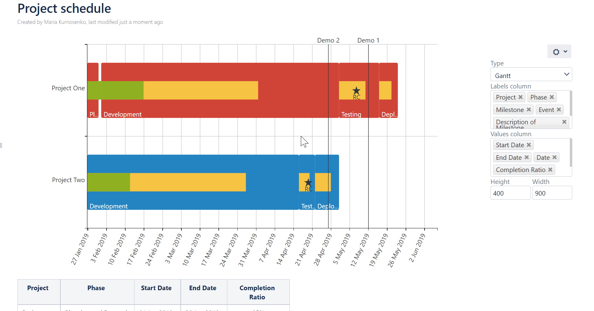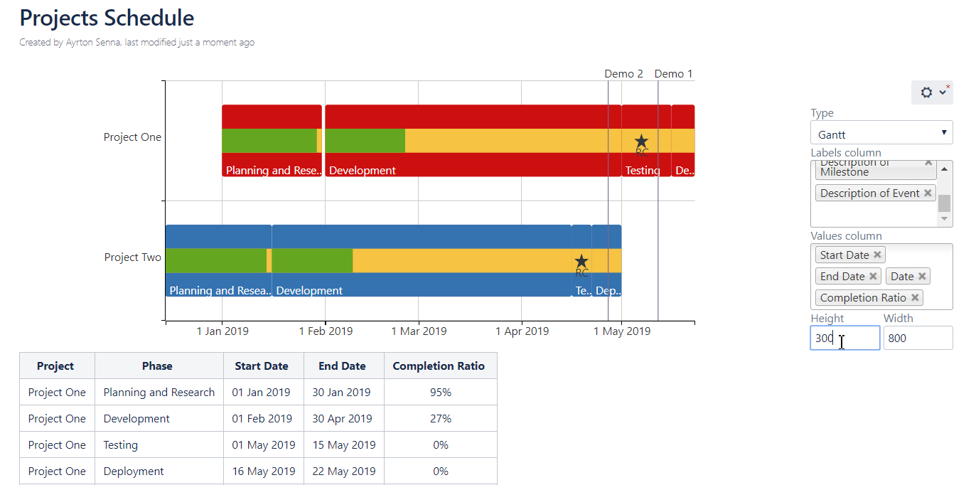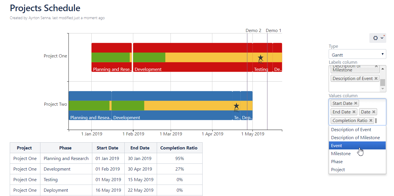 See also a blog post: 5 Tips to Become a Gantt Chart Expert Using Atlassian Confluence to learn more about the completion ratio, events, and milestones on the Gantt chart.