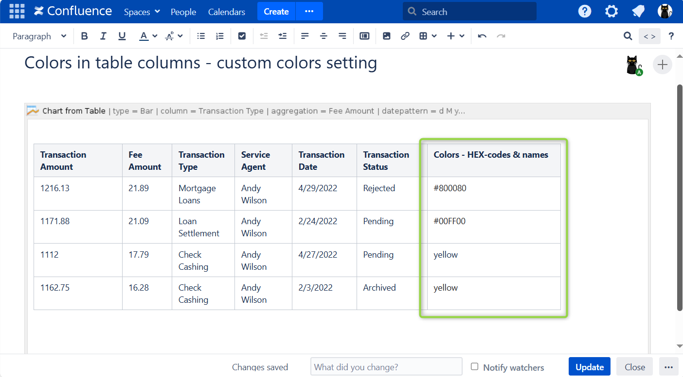 The Colors in the table columns setting enables you to add colors as either its simple name (e.g. green, yellow) or a HEX code (e.g. #808080-> gray) in a new custom-added column to paint values of the Labels column(-s) specified in the data series field of the chart.