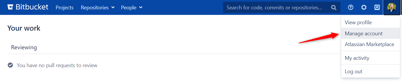 After installation of the app, every user of Bitbucket can add TeamCity access tokens to their account. To get to the token management page, you need to click on your avatar in the header and choose Manage account.