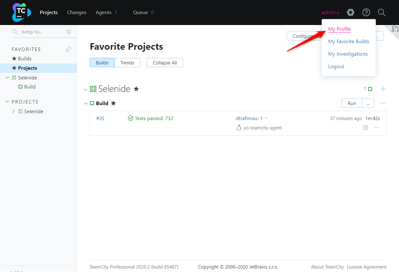 First, you need to go to your TeamCity server, click on your username in the header, then go to My Profile.