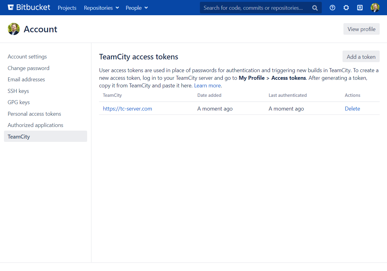 After you've added a token, you'll be able to see it with its details among the others in the list. From here, you can also delete a token if needed. Note that it will only be deleted from Bitbucket but will remain in TeamCity.