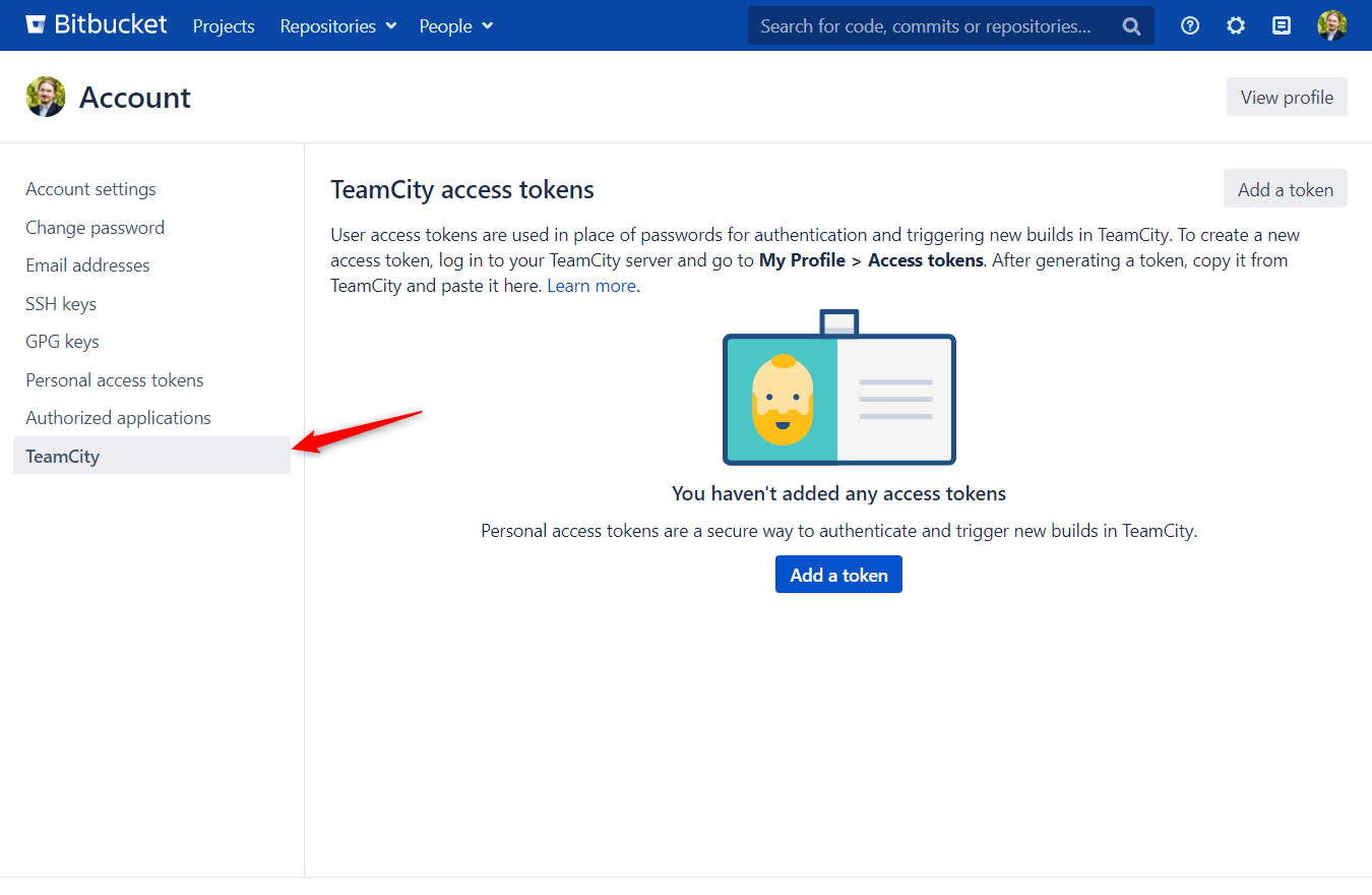 Then you'll need to click on the TeamCity tab in the navigation bar to the left. After that, you'll get to the token management page, which will look like this when you first visit it: