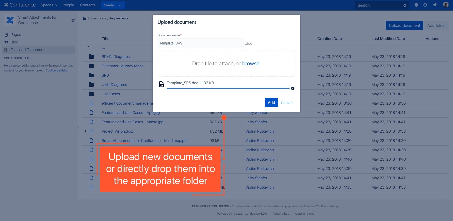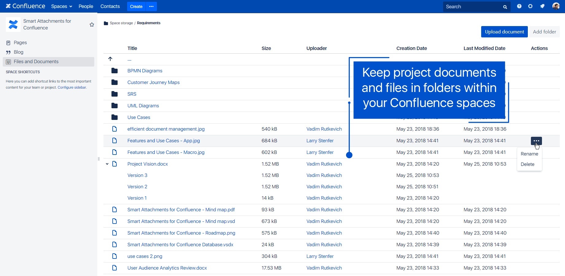 Now you can have the centralized space storage within your Confluence. Here you can define the convenient structure of folders for storing files and easy navigability among them.