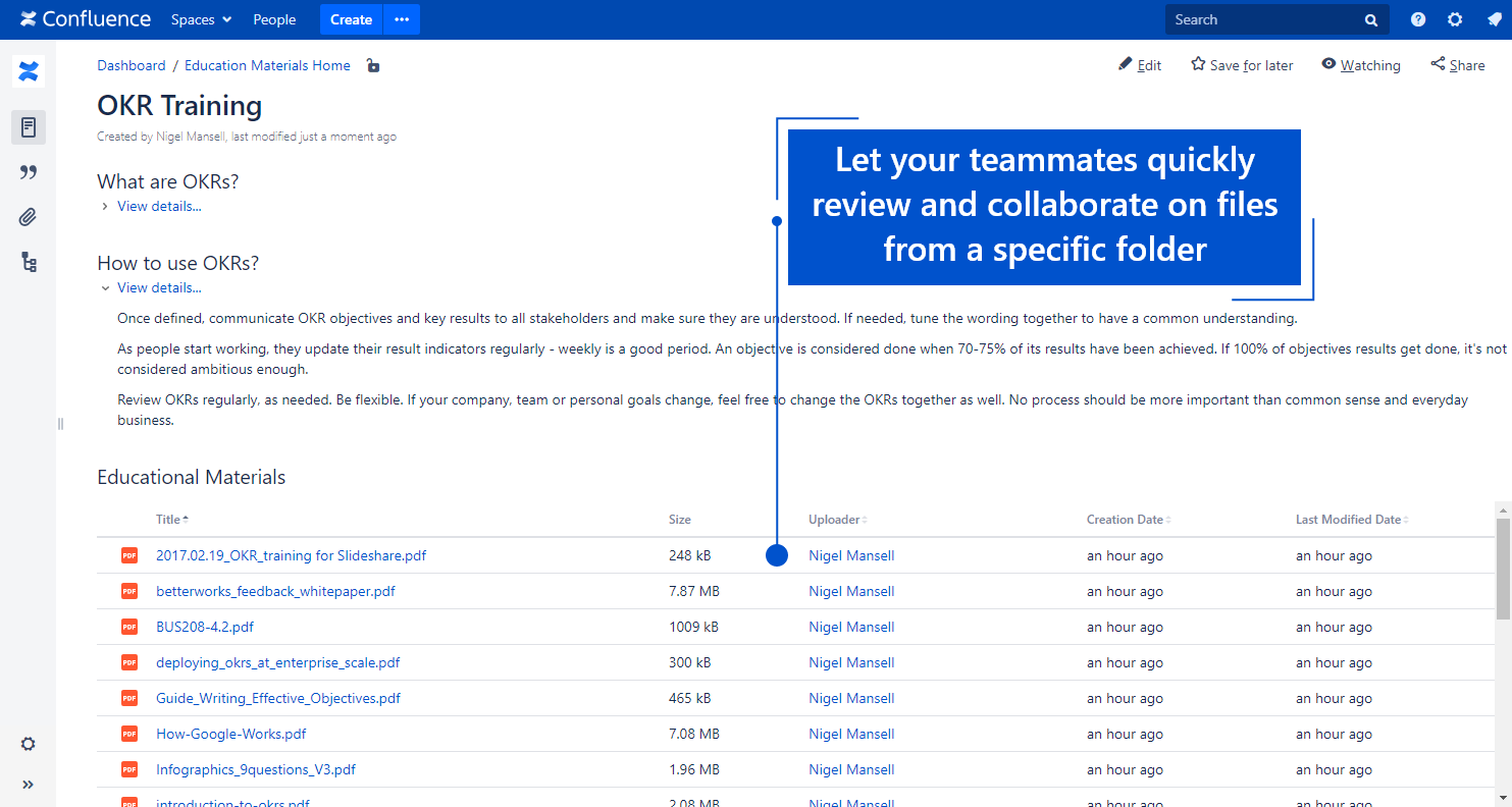 Now you can embed documents from a specific folder into the Confluence page. So your teammates can instantly see the files from this folder on a list and collaborate on them.