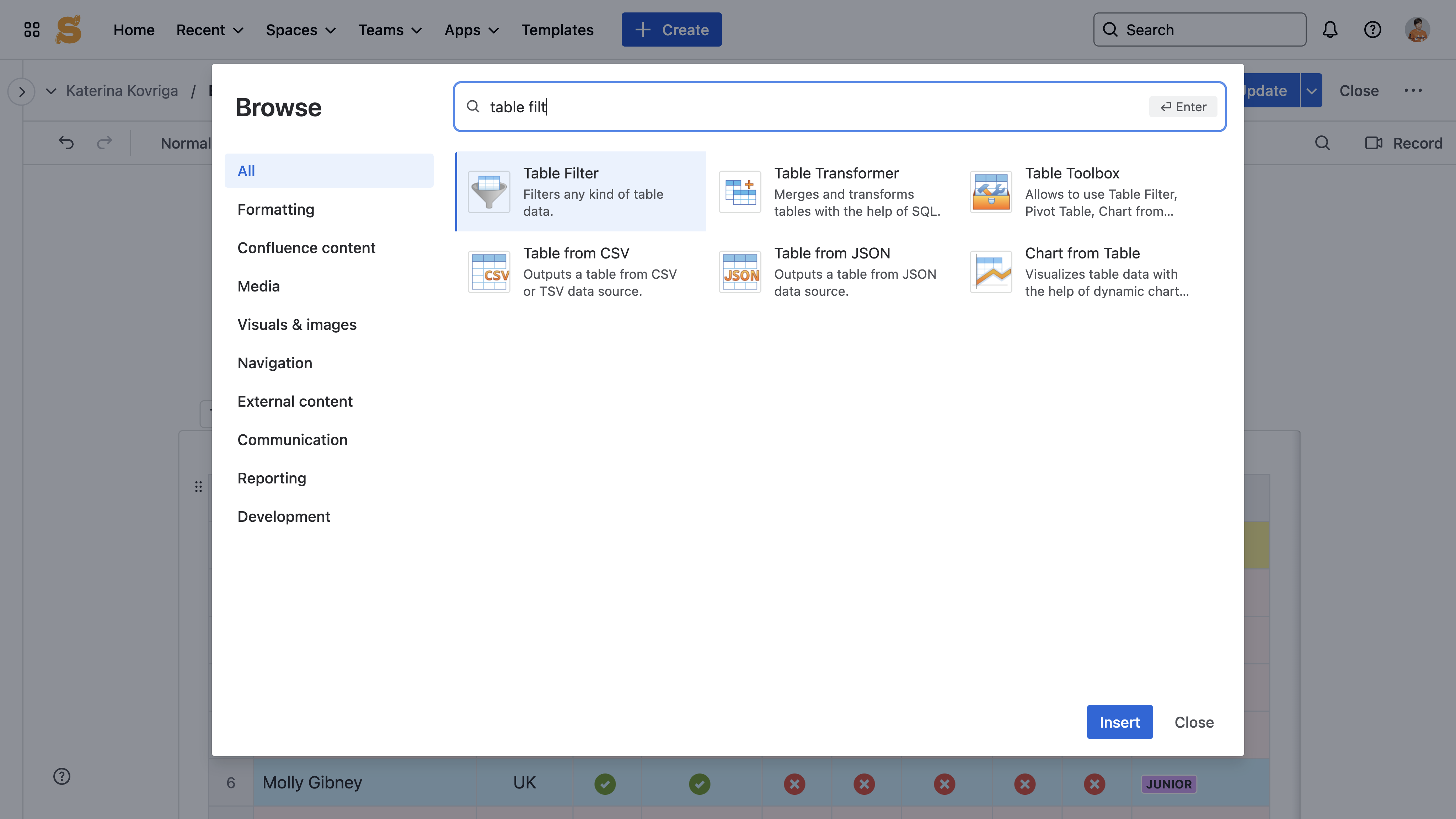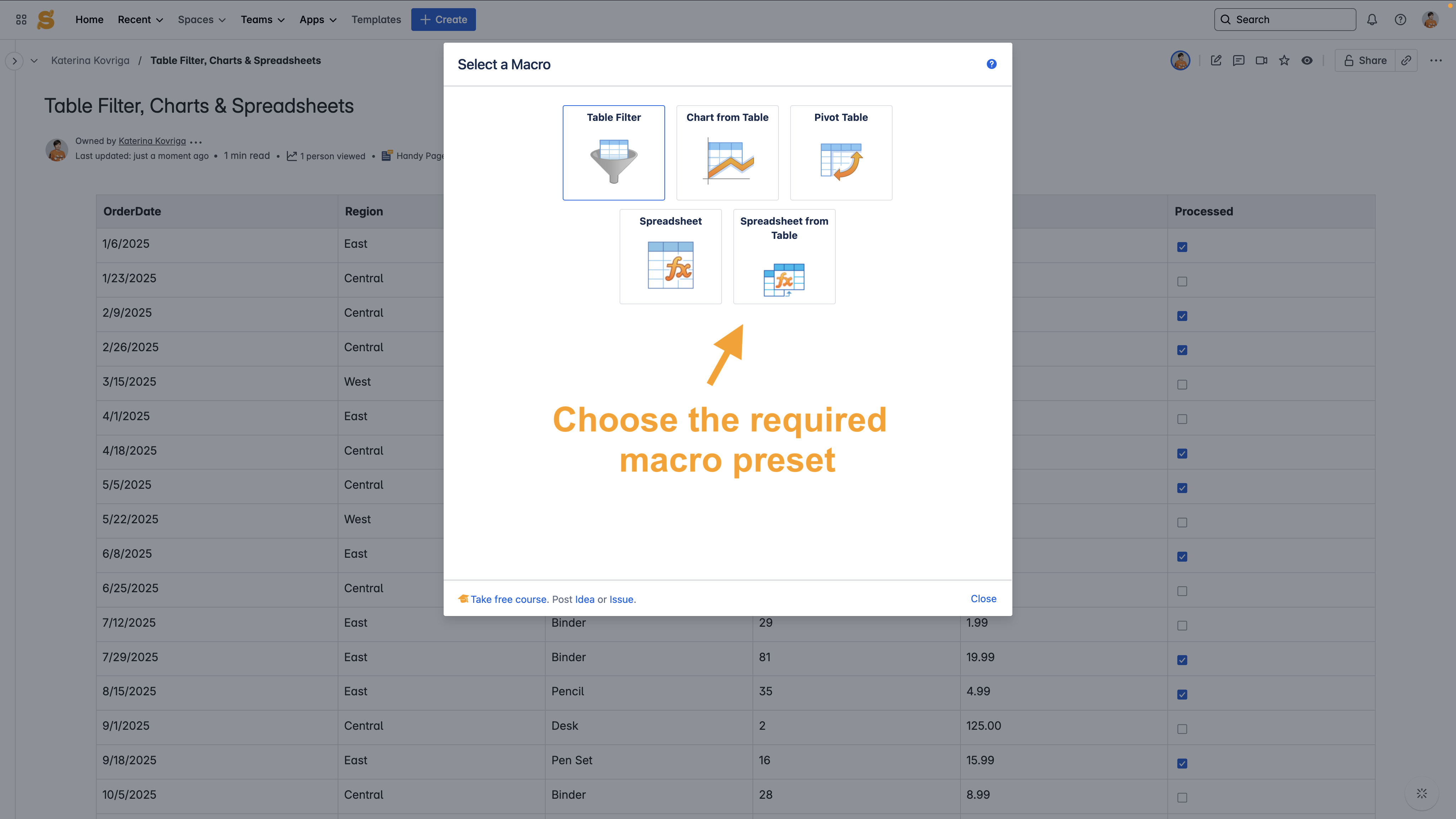 - Select the Table Filter/Pivot Table/Chart from Table/Table Transformer/Table Excerpt macro.