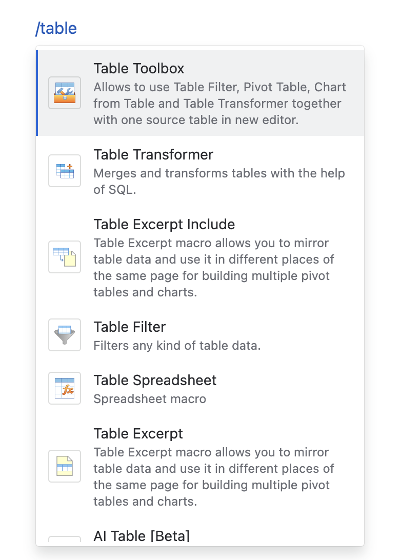 - /Table Filter, /Pivot Table, /Chart from Table, /Table Transformer, /Table Toolbox, etc. (for the new editor on Cloud)
