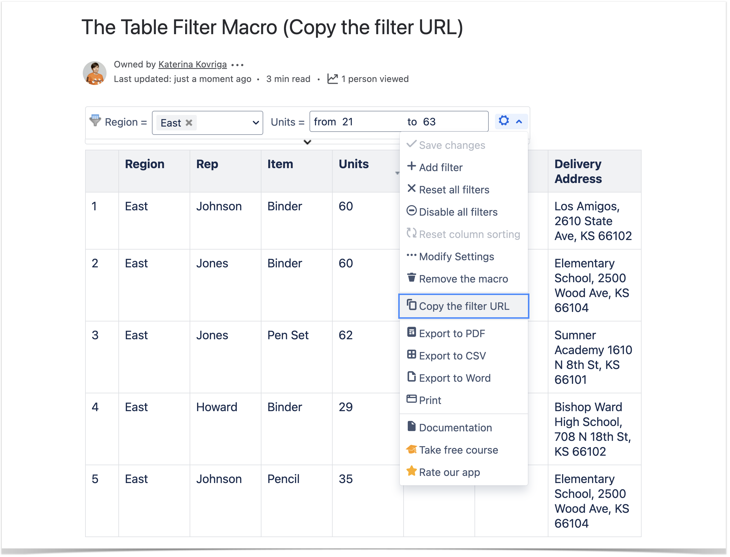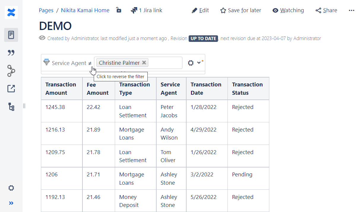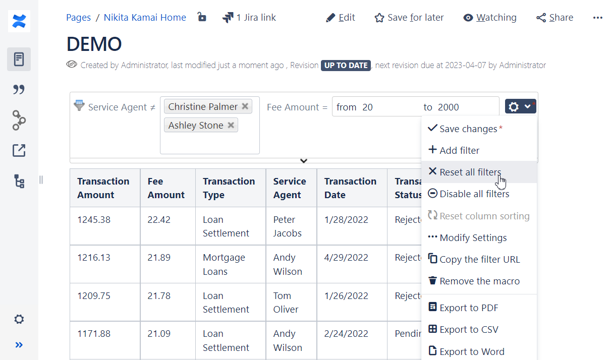 If needed to filter and edit the table on the go, switch to the page edit mode, select the macro and click Show filter. All the options of the filtration pane are available in the page edit mode in Server and Data Center versions of the app.