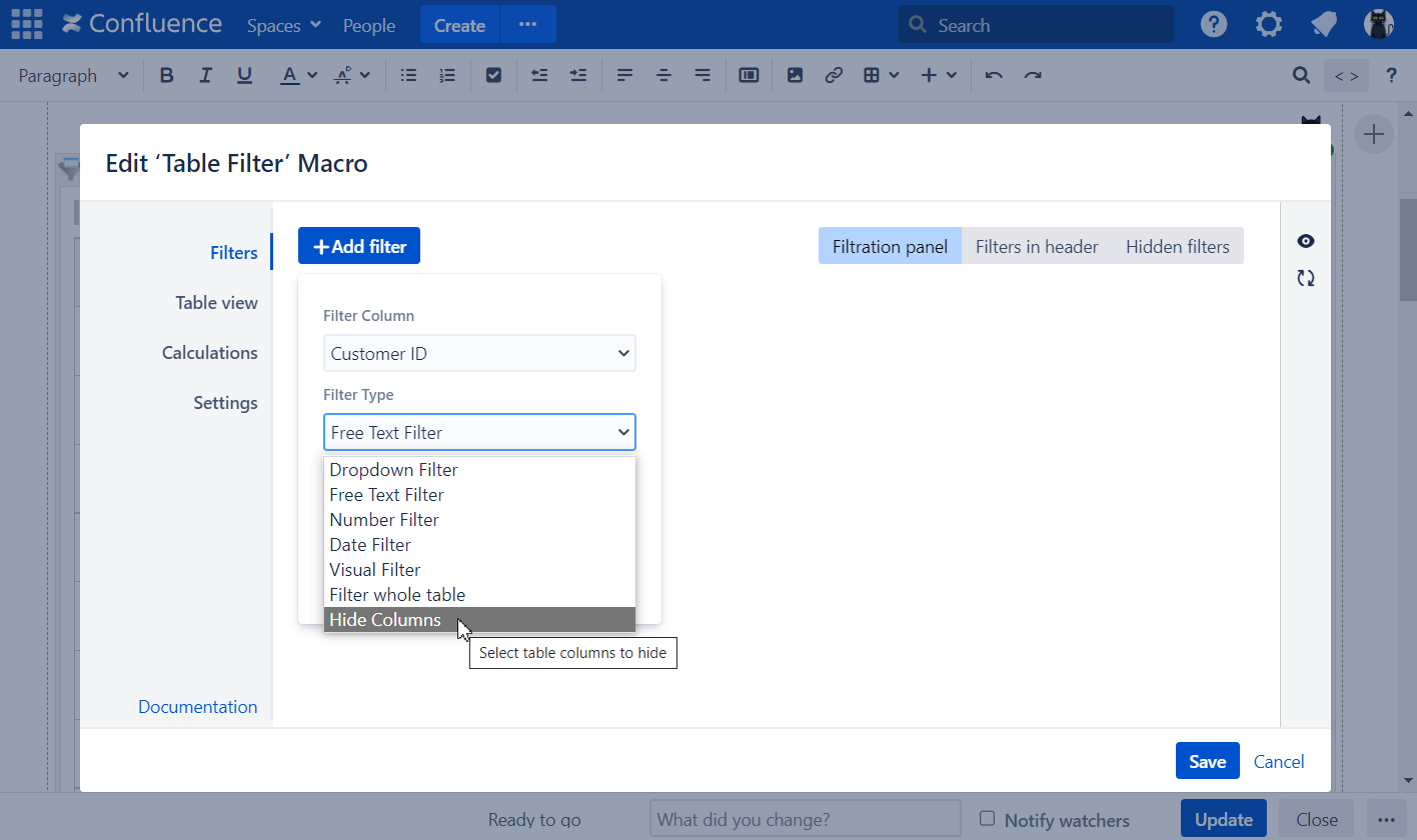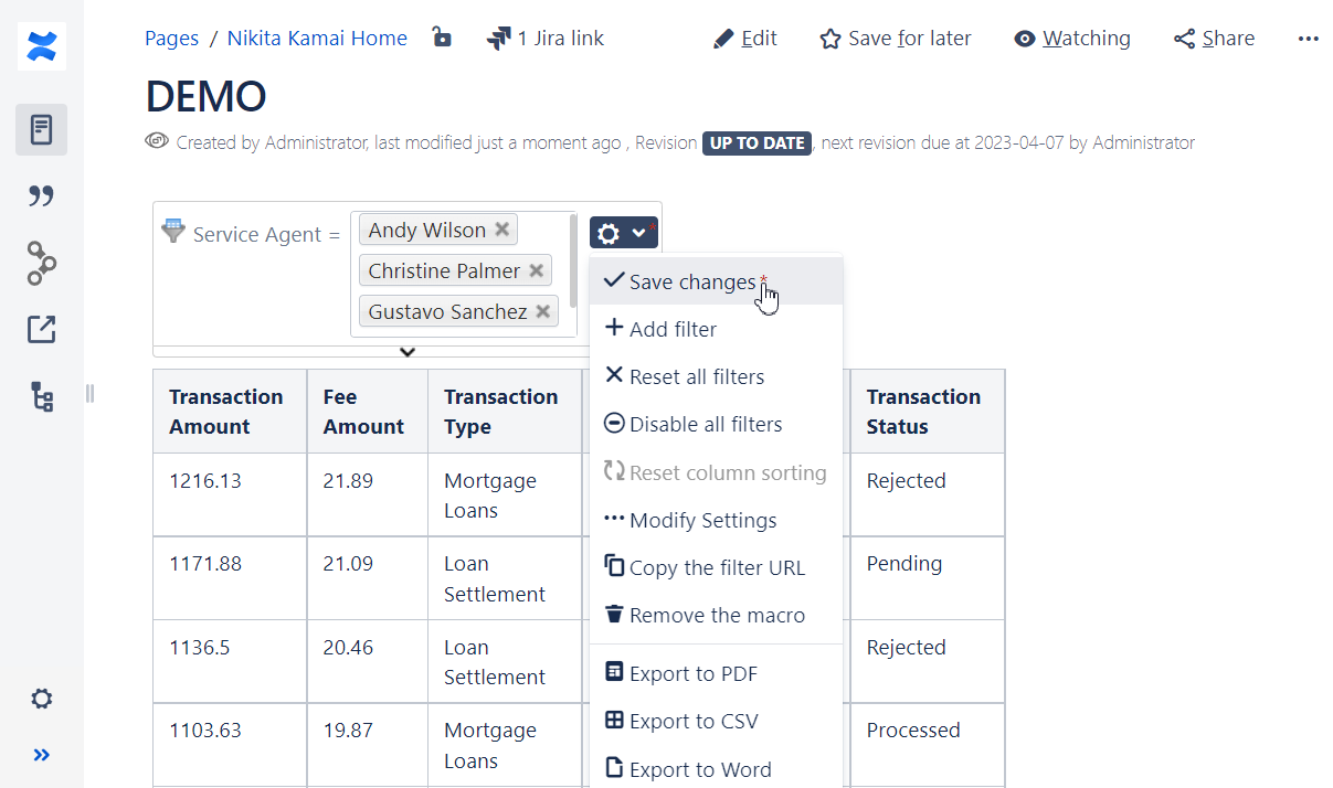 - To save the changes and insert the Table Filter macro click the funnel icon in the top right corner and select Save changes.
