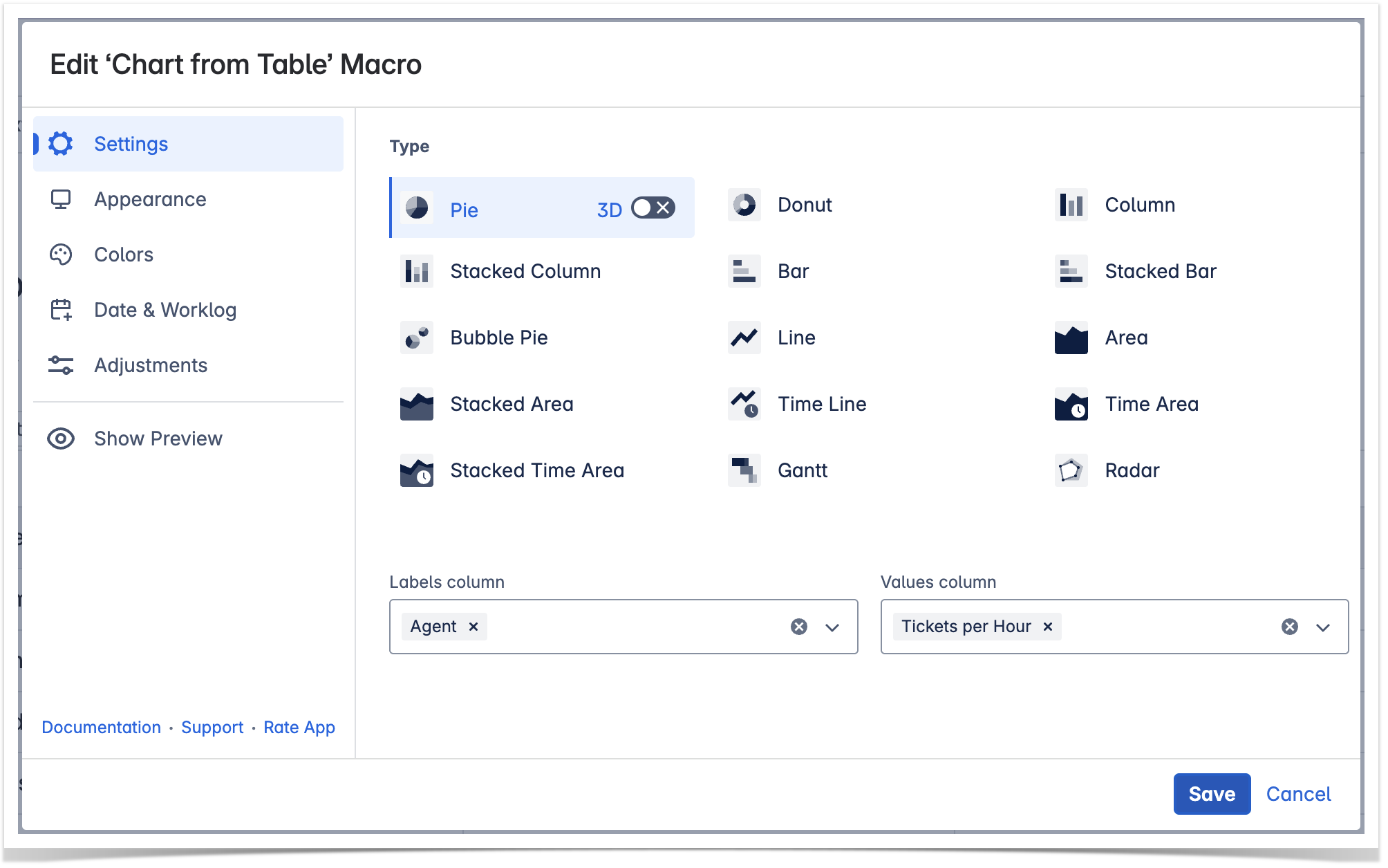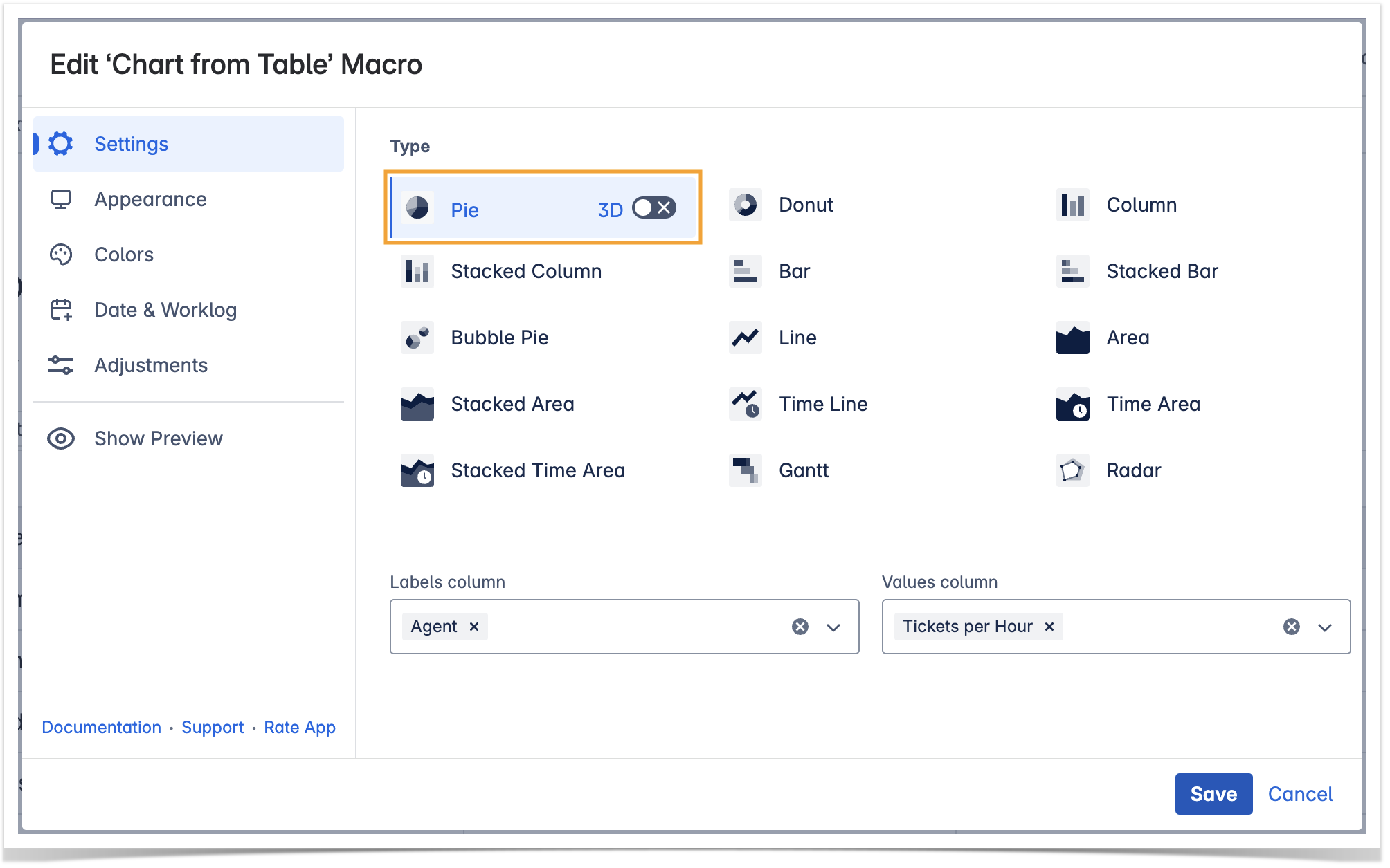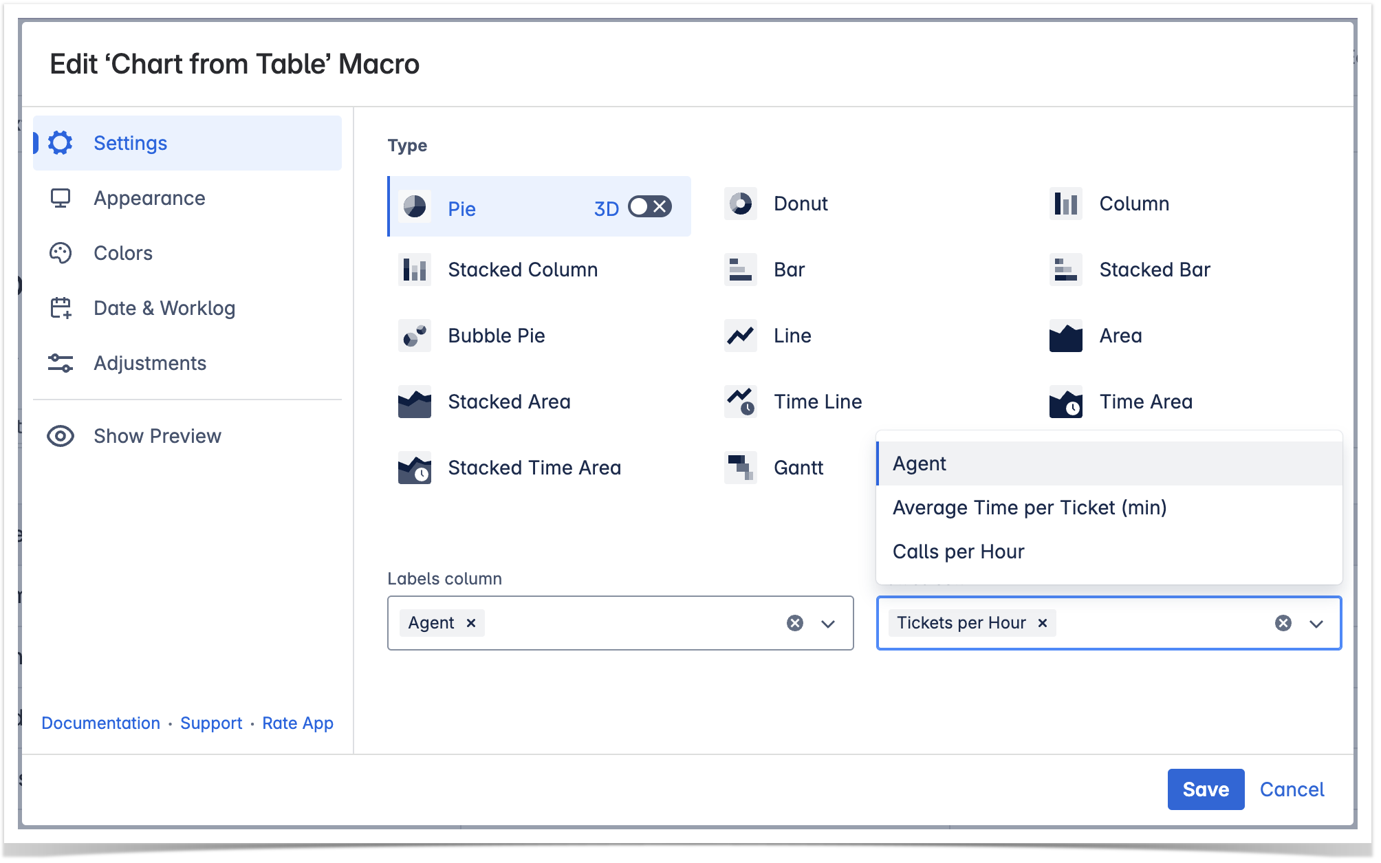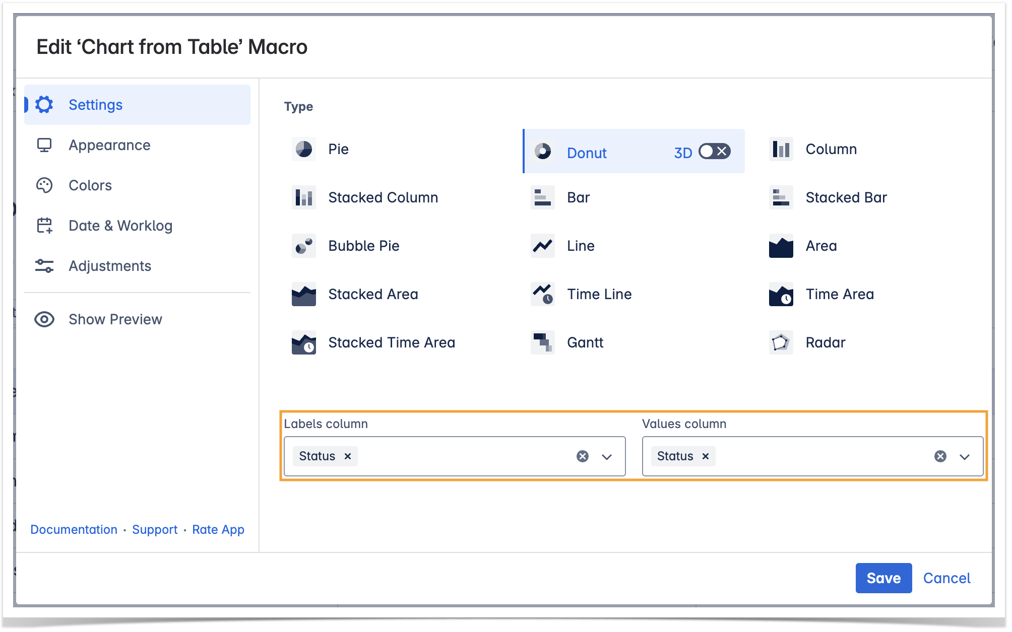 4. Locate the Labels column and Values column options in the Settings tab and select the table columns containing data for chart generation.