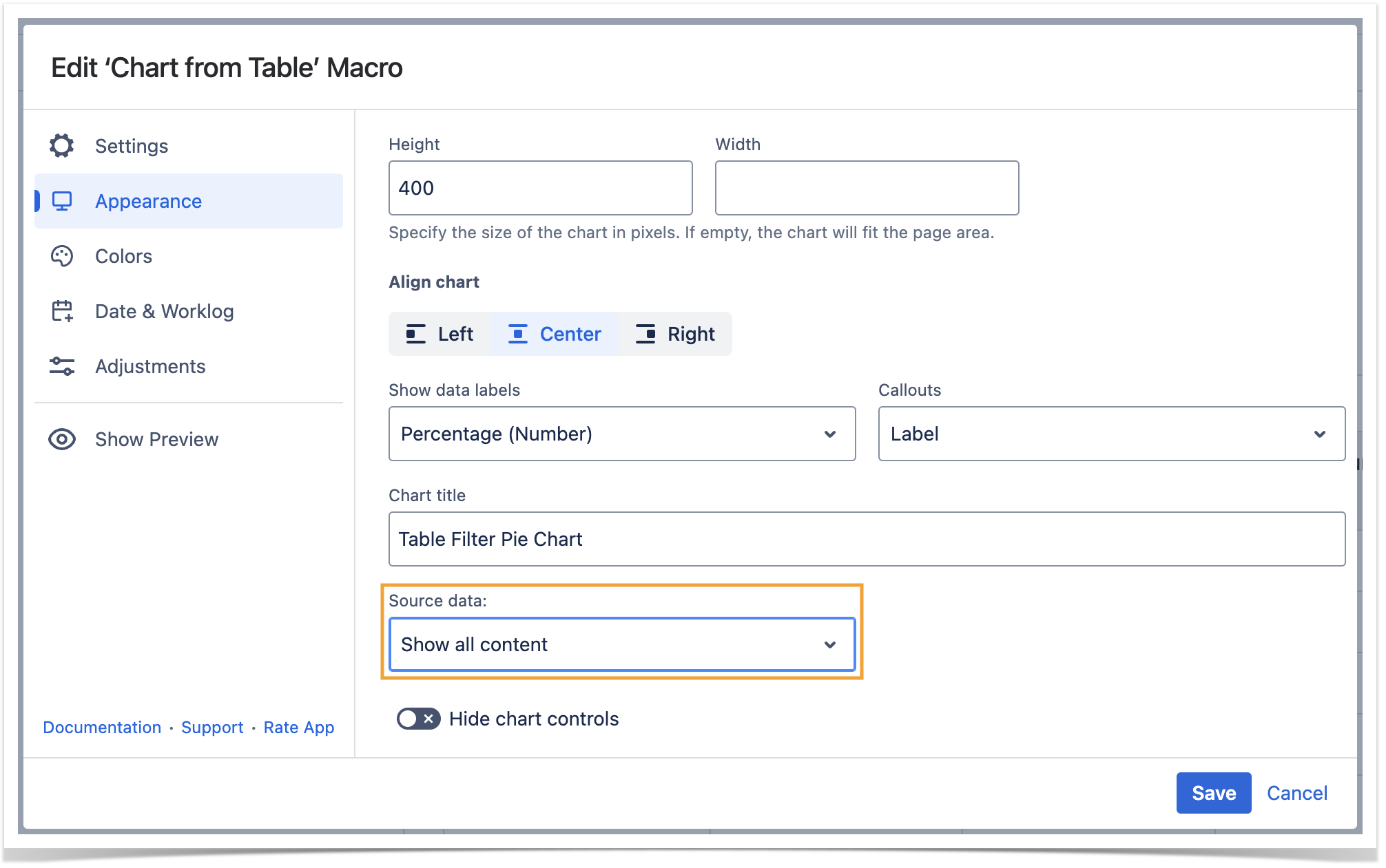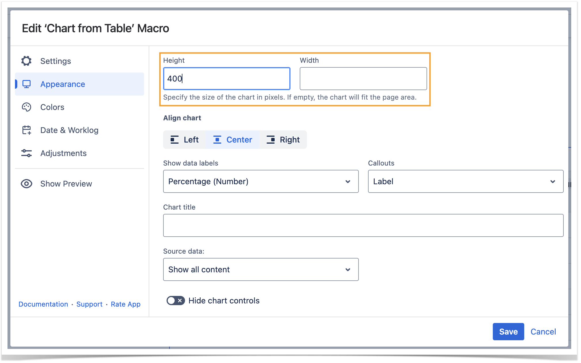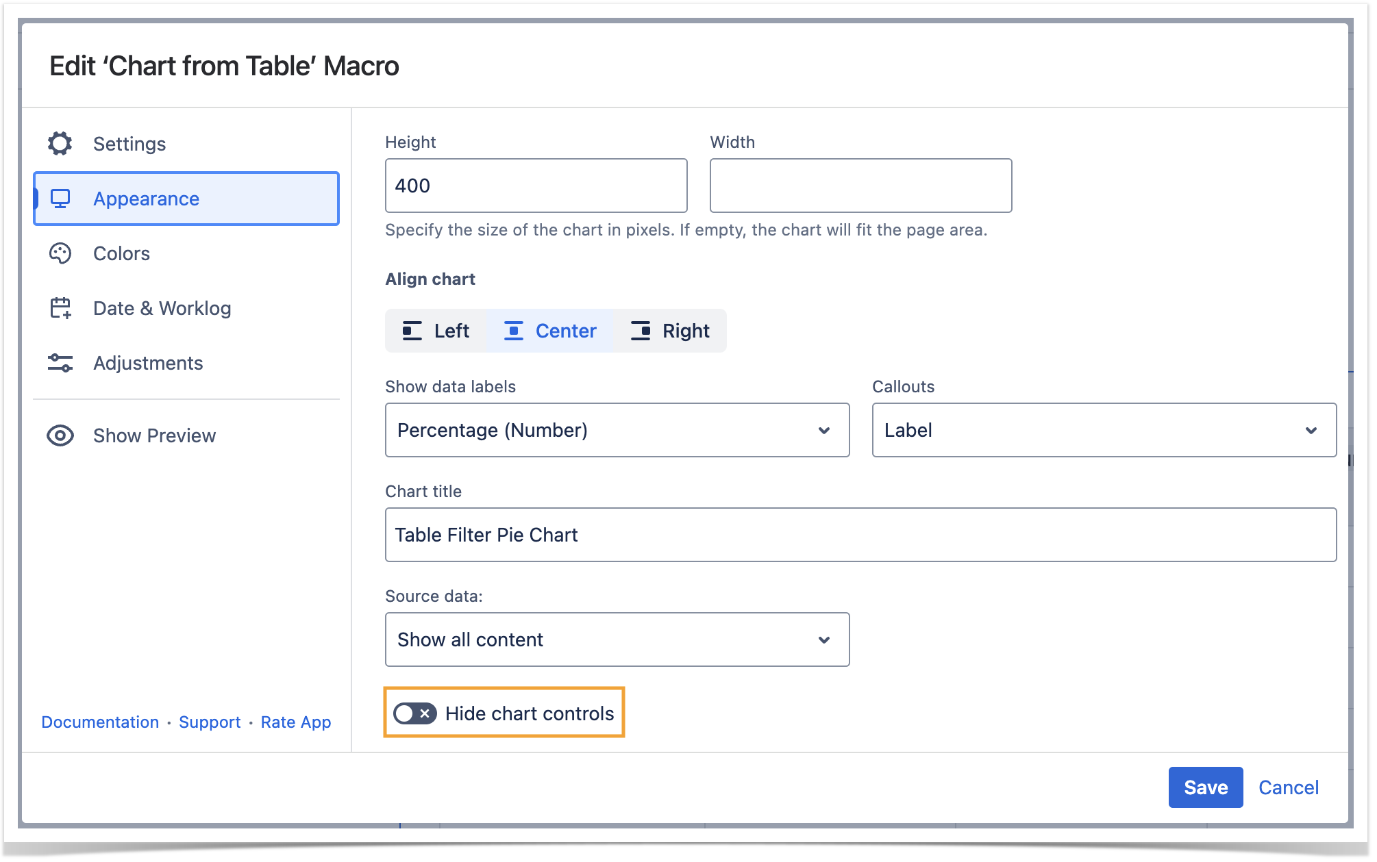 While working in the edit mode, use the Show/hide preview option to adjust the required settings before saving the macro and publishing the page.