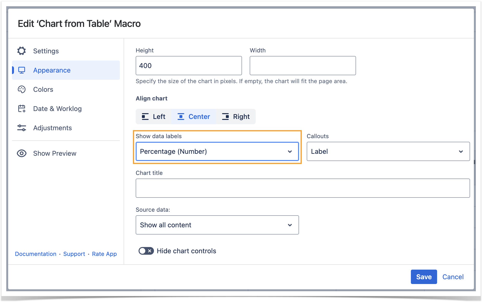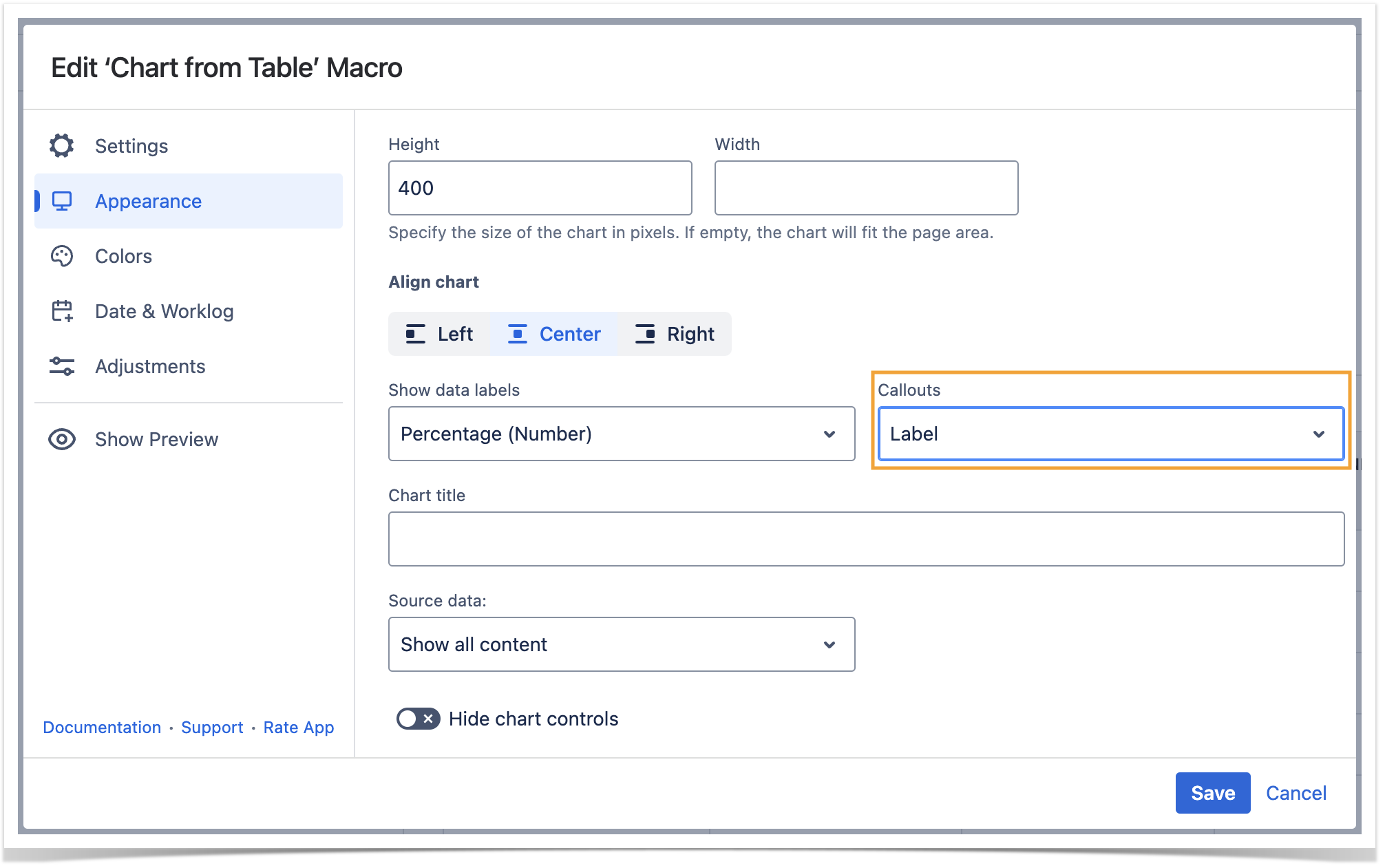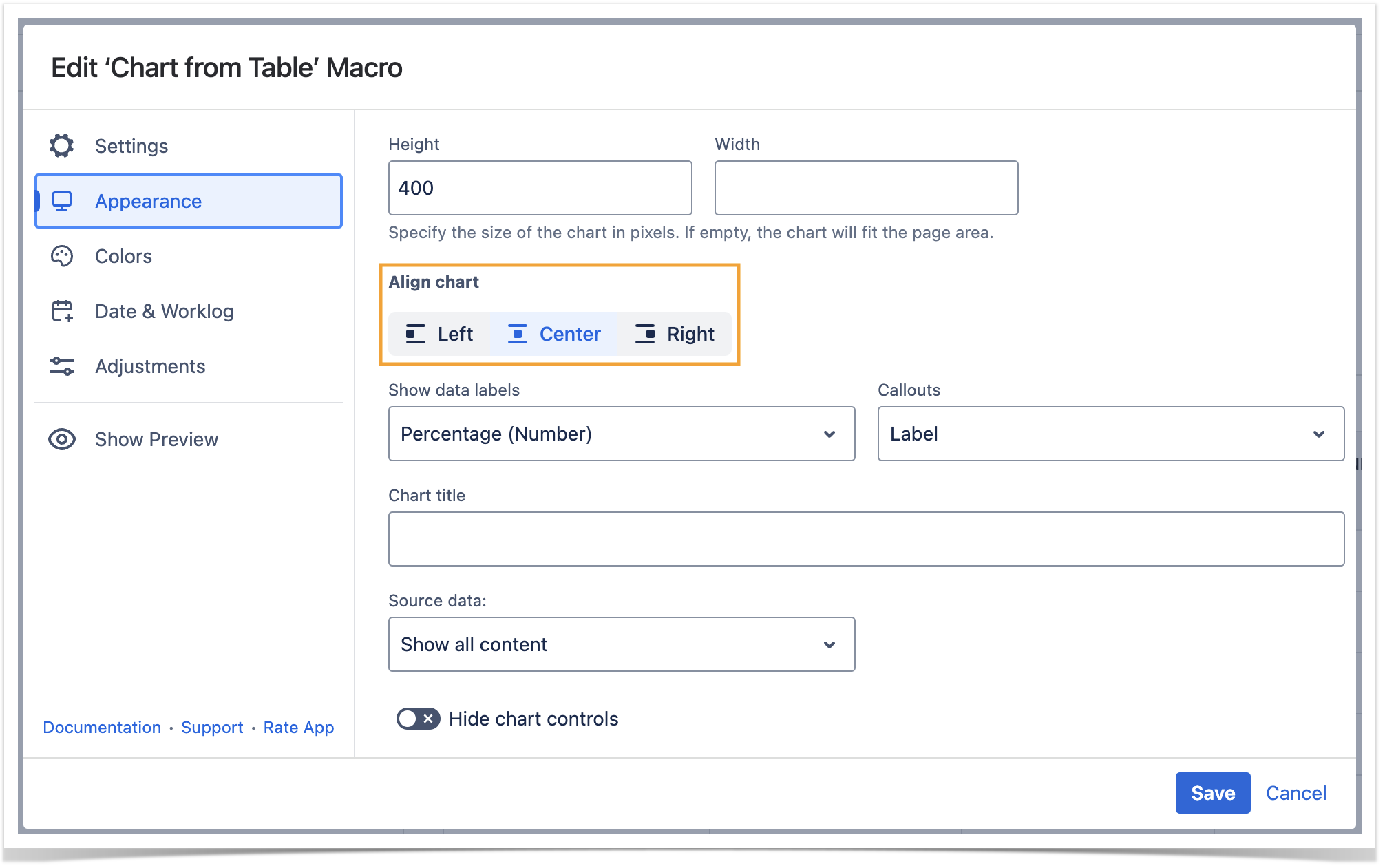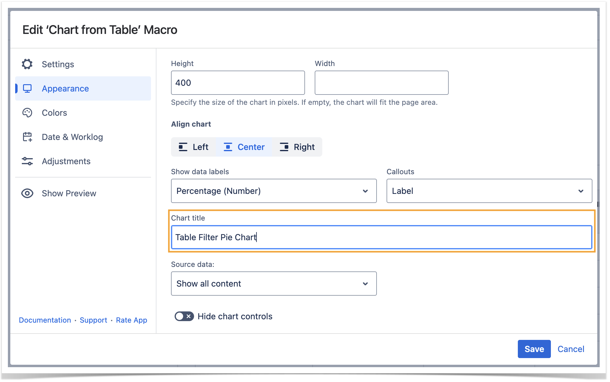 While working in the edit mode, use the Show/hide preview option to adjust the required settings before saving the macro and publishing the page.