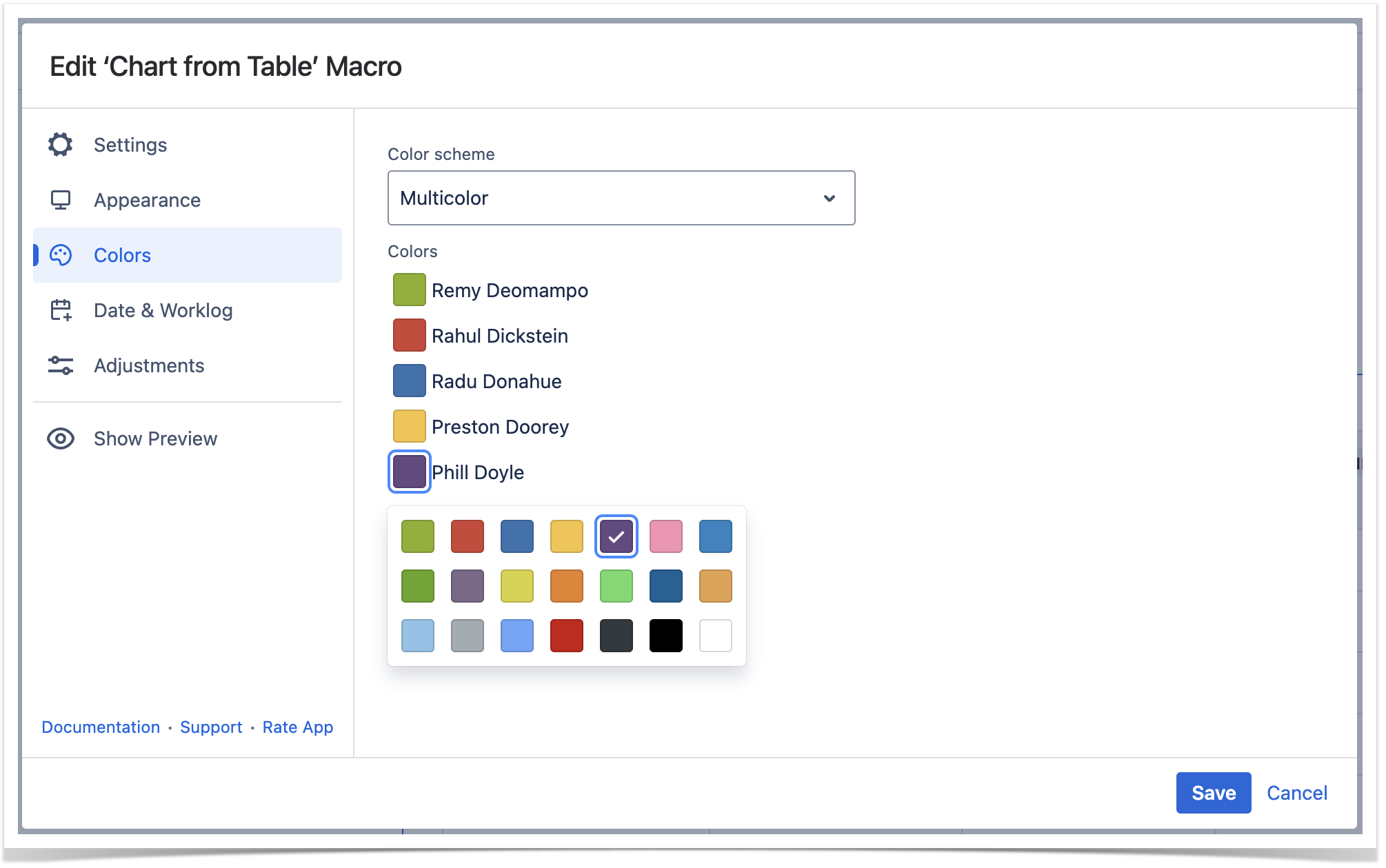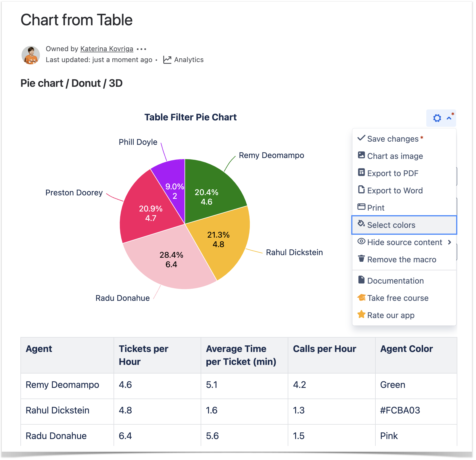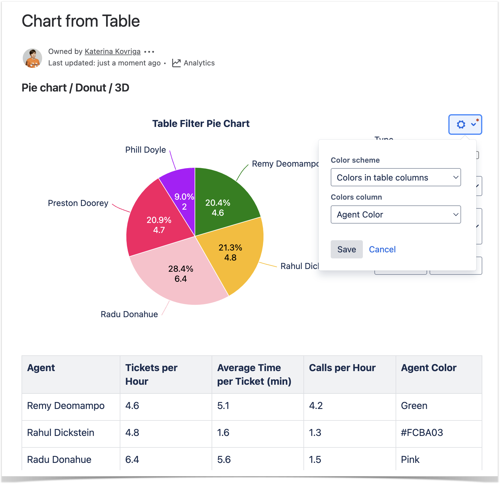 2. Click the cogwheel icon, locate the Select colors option. Select the Multicolor or Colors in the table columns option. Pick the colors or columns with colors and click Save. The chart will be automatically regenerated.