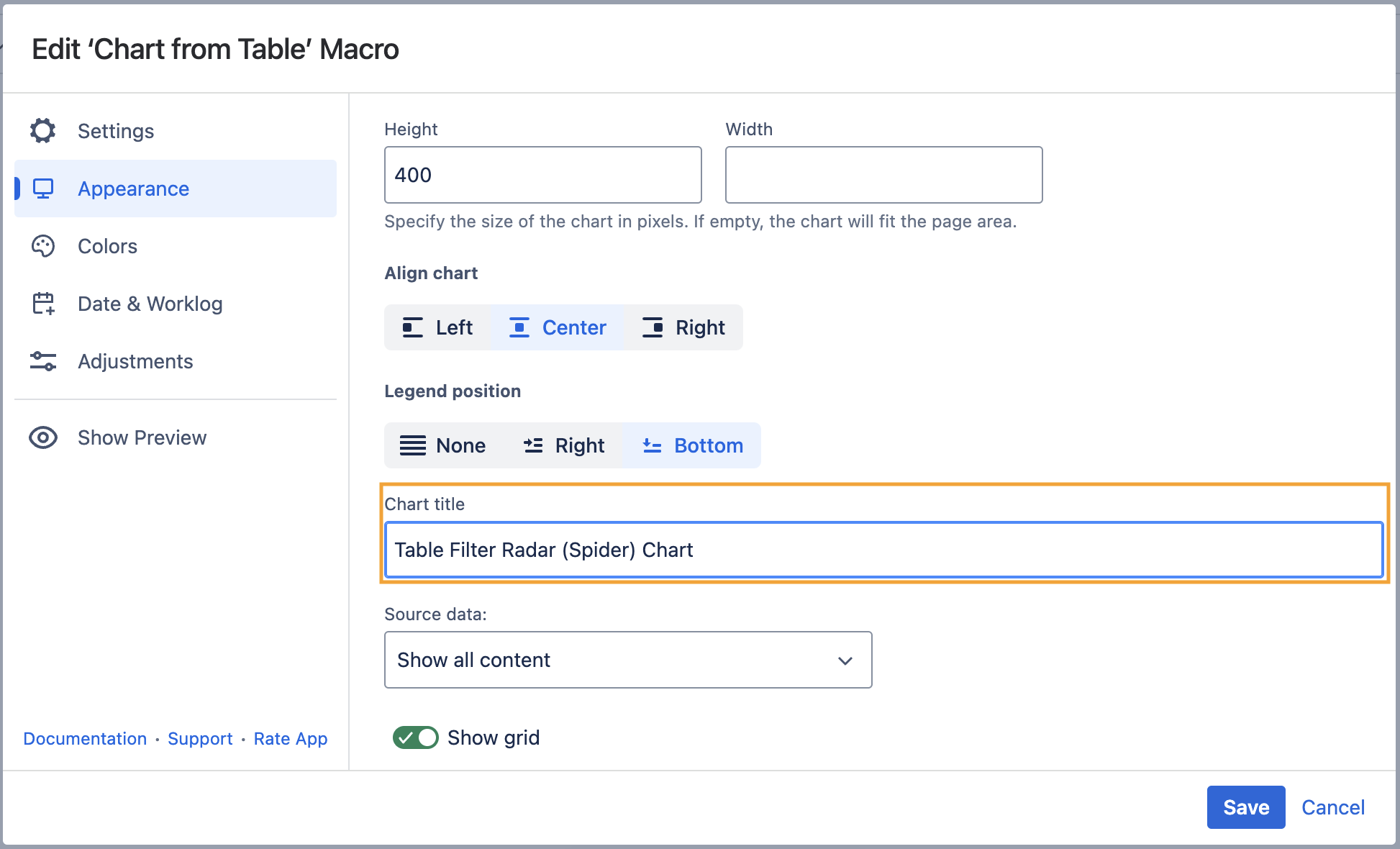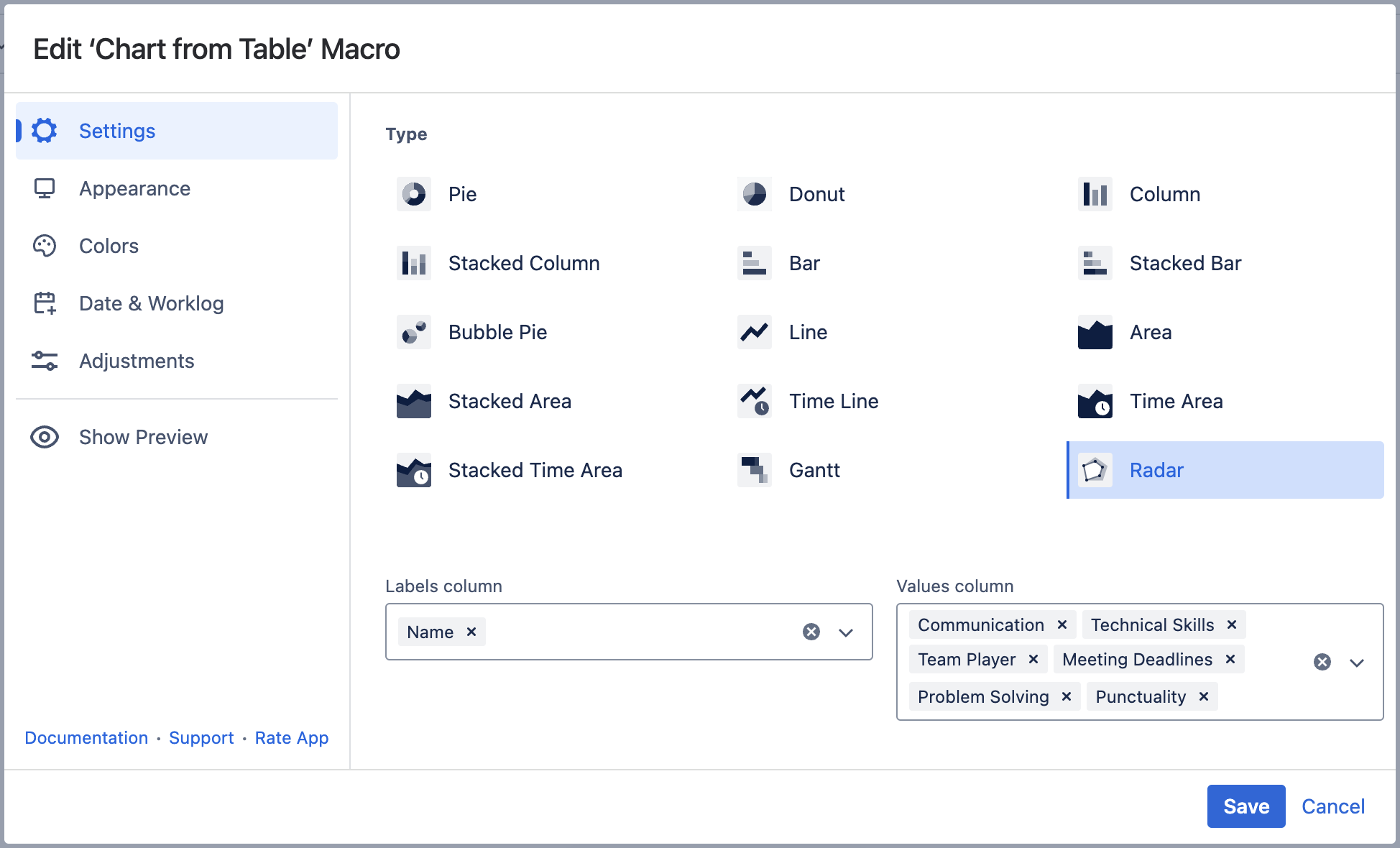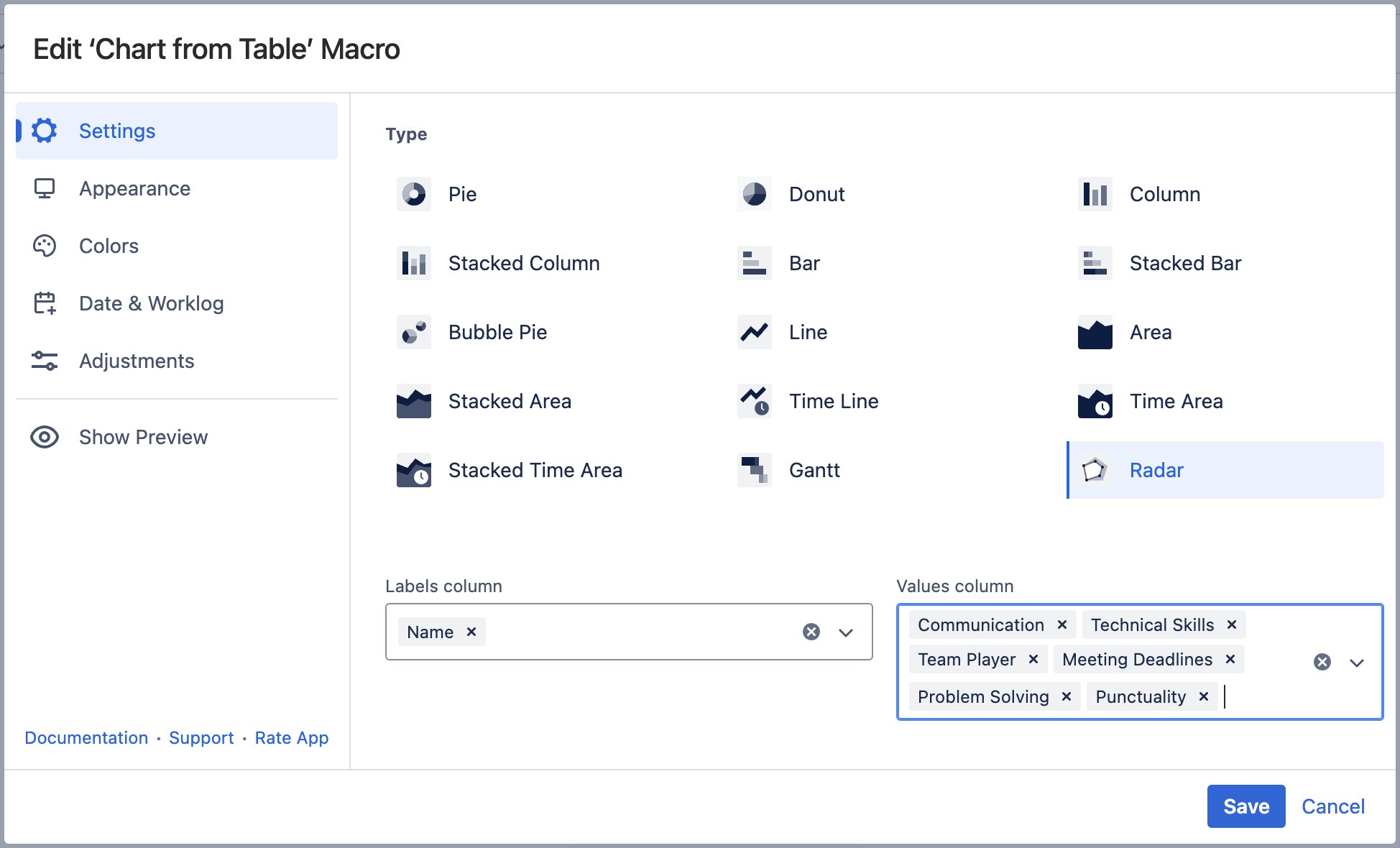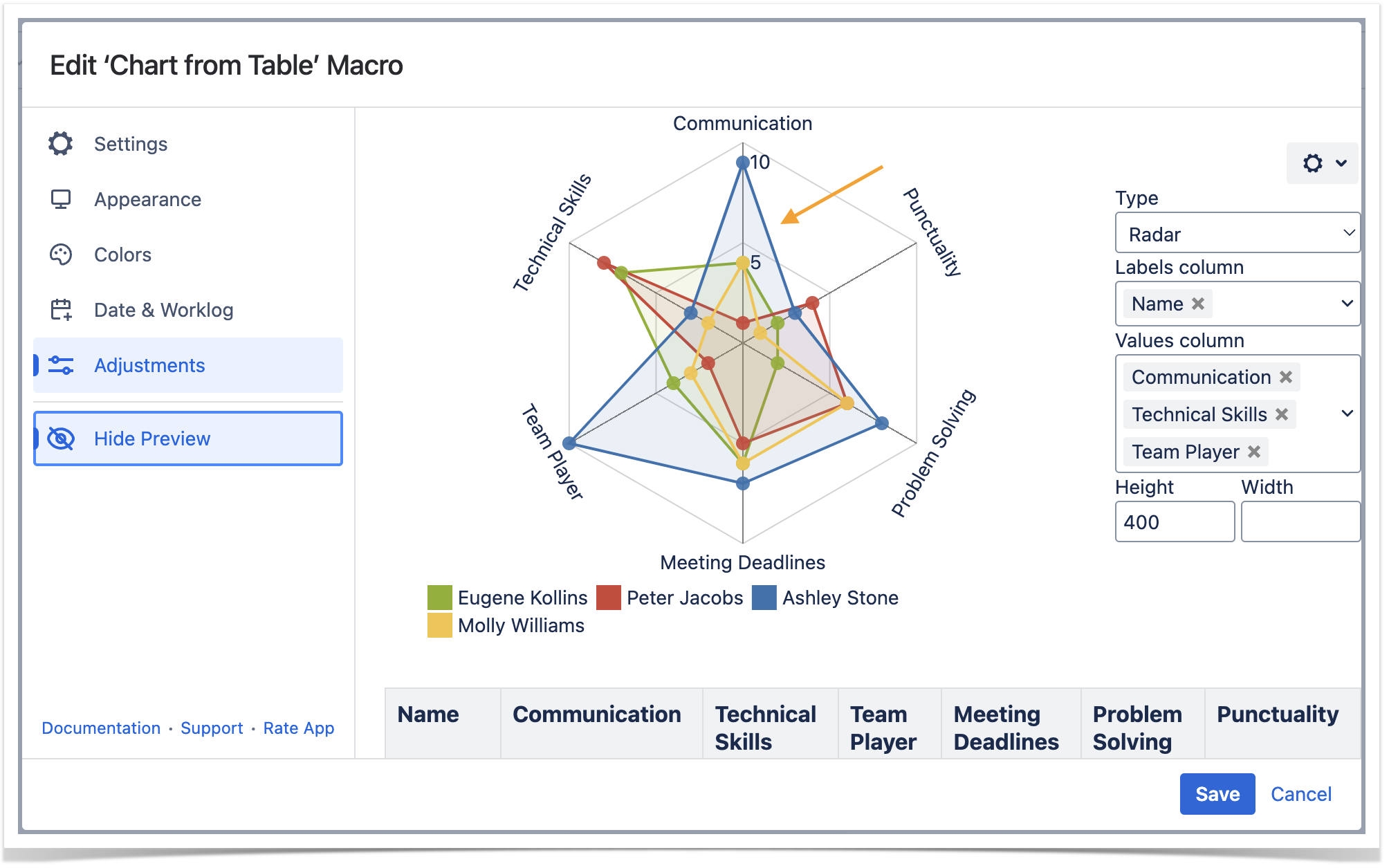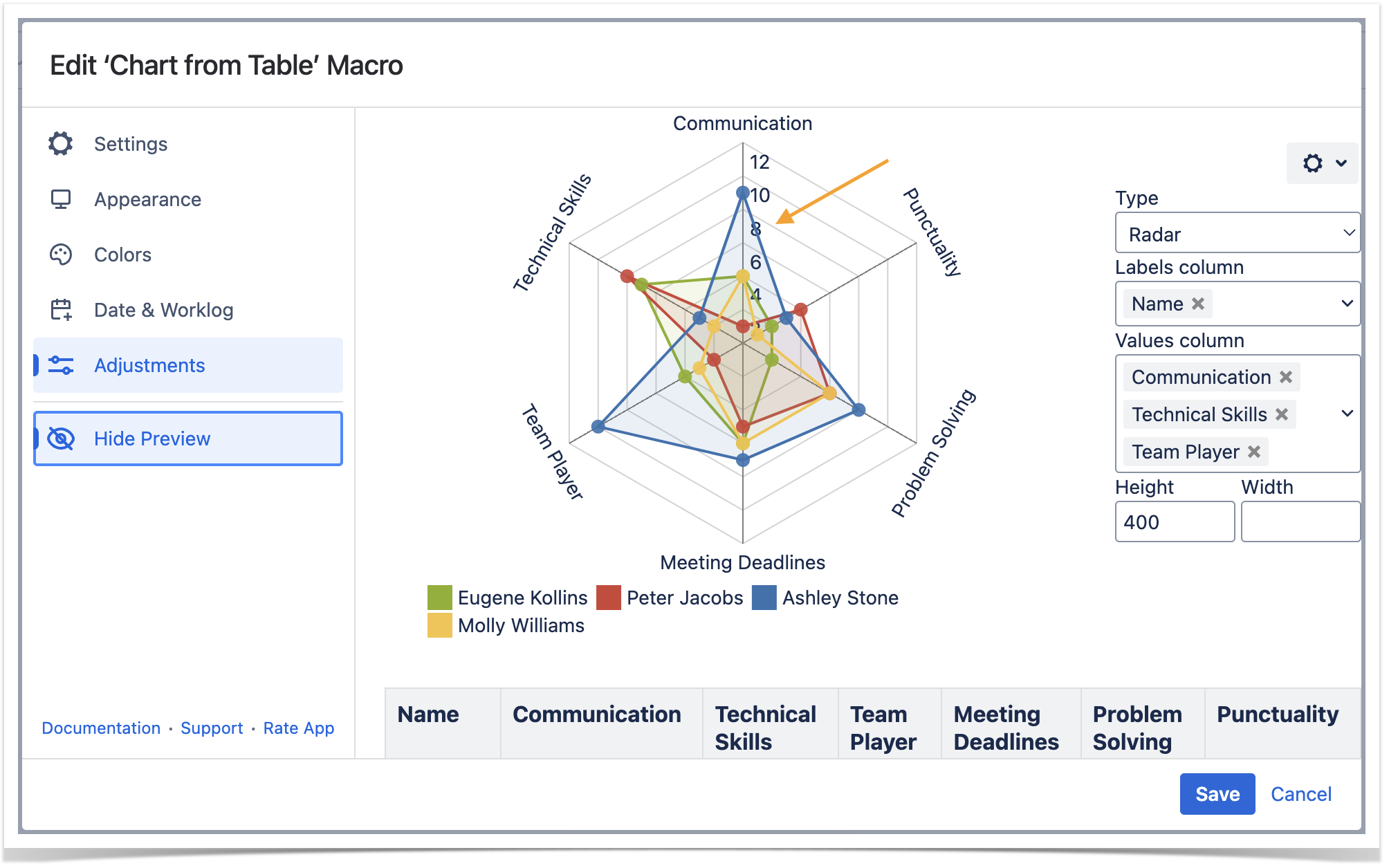 - Insert the Chart from Table macro and paste the table within the macro body.