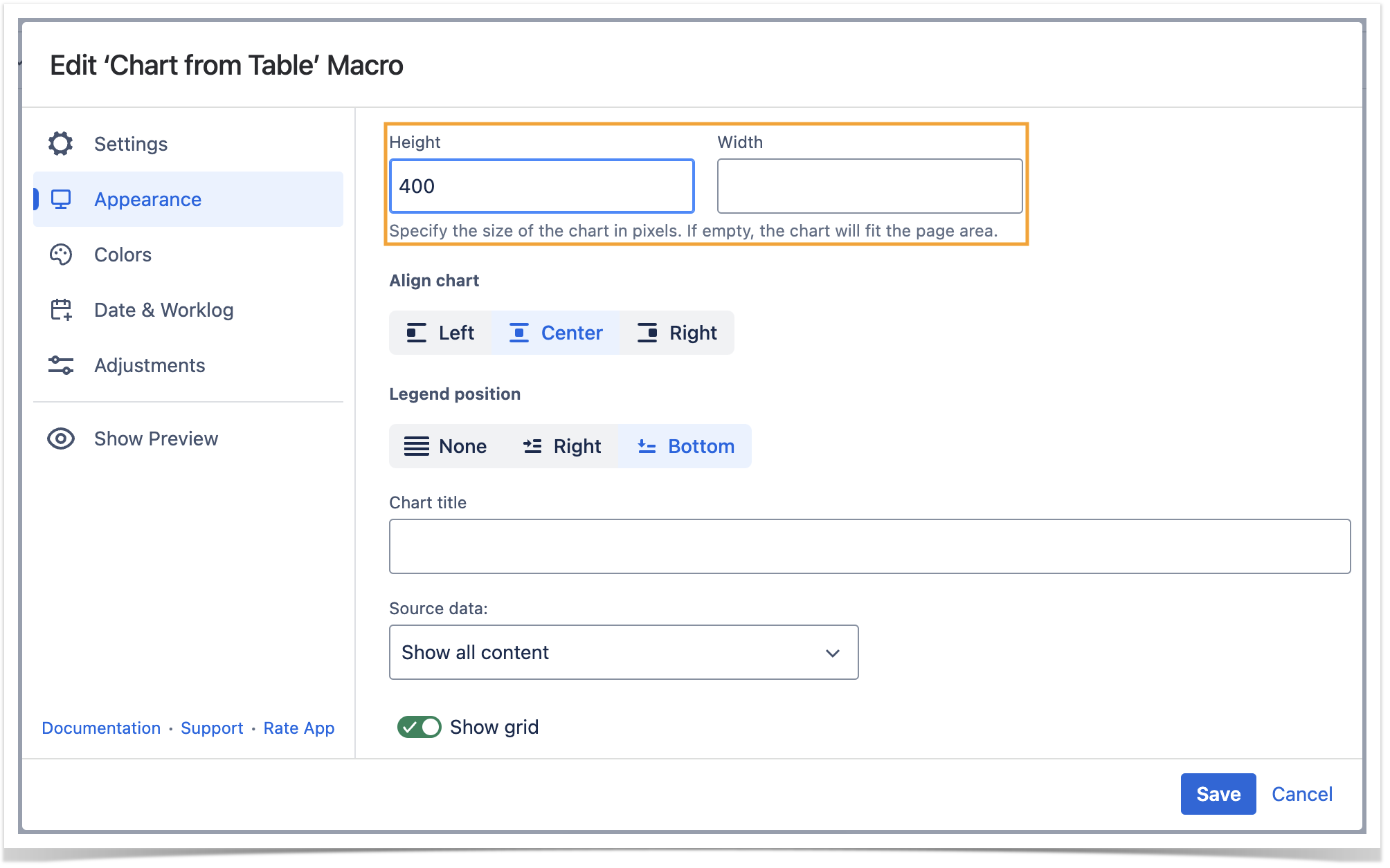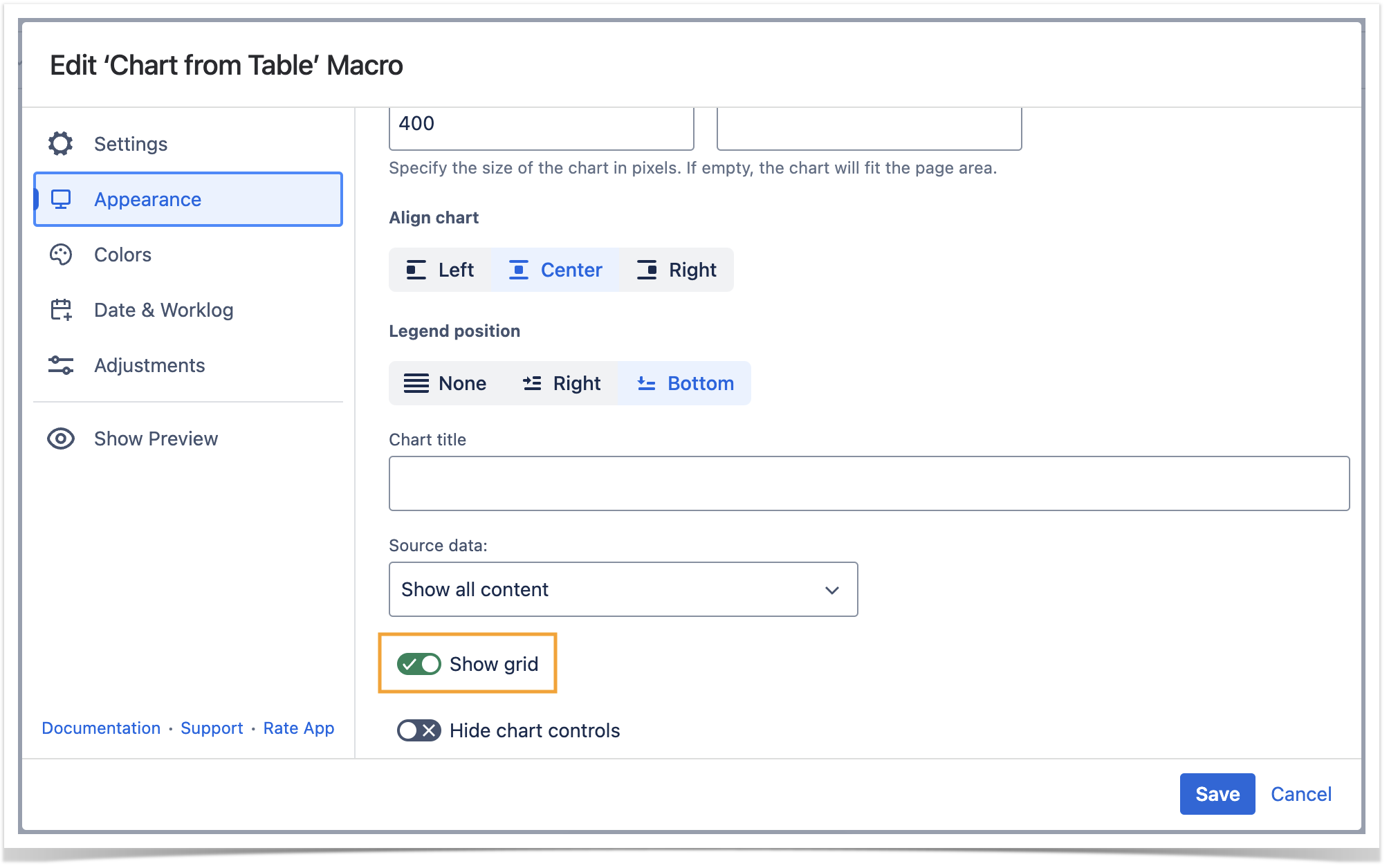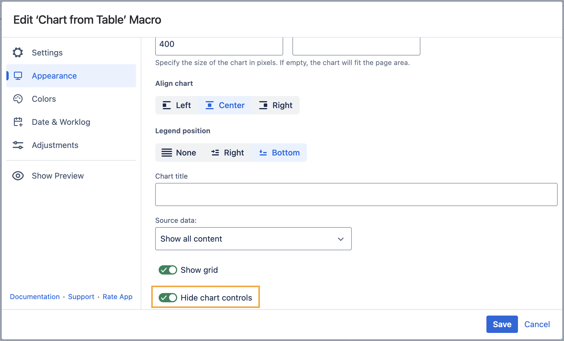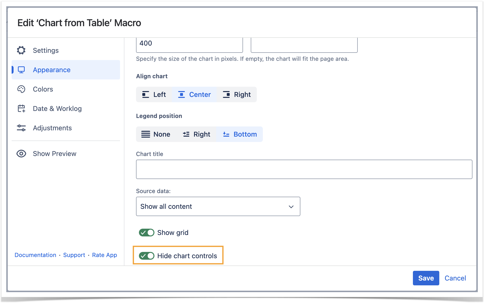 While working in the edit mode, use the Show/hide preview option to adjust the required settings before saving the macro and publishing the page.