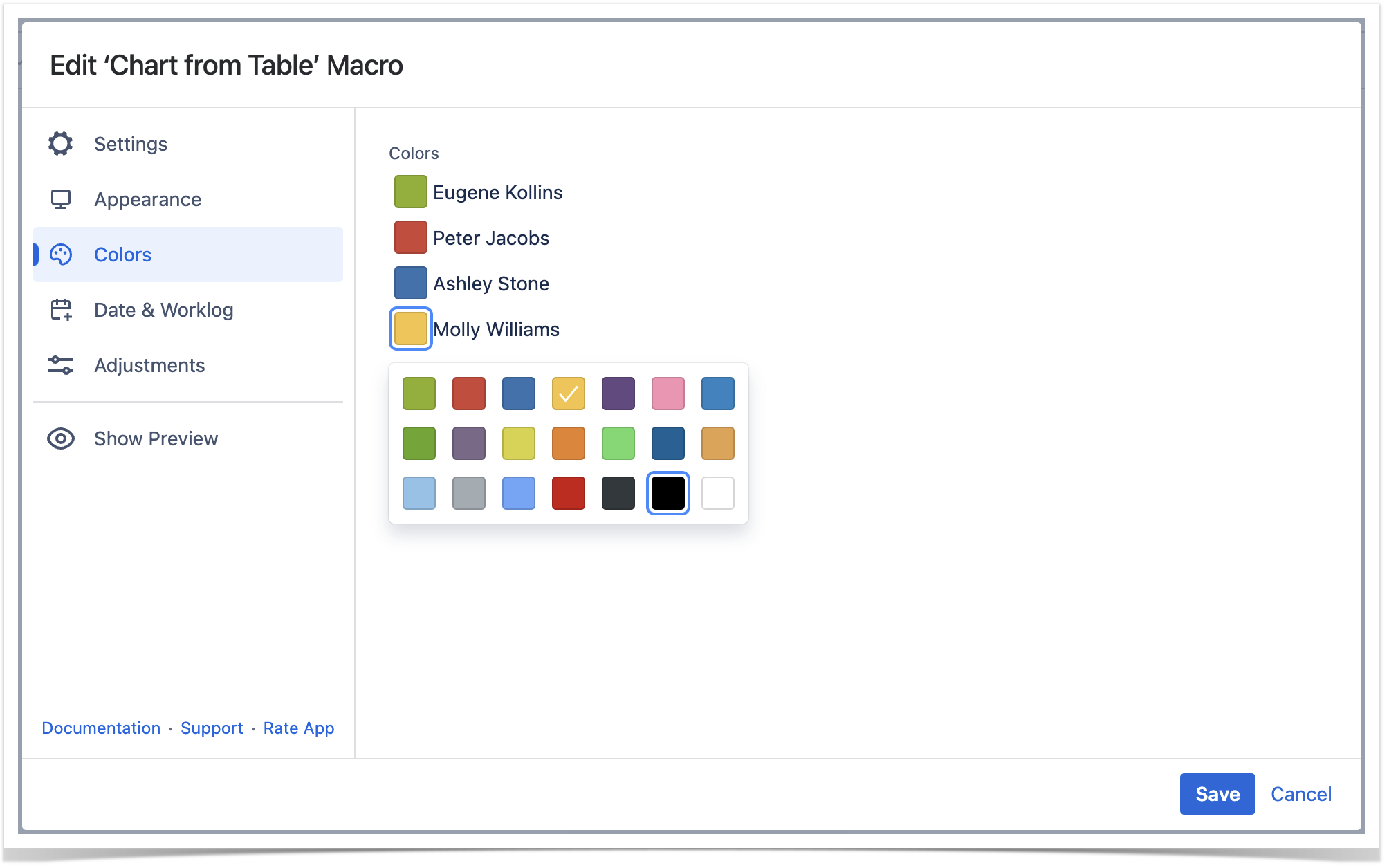 - Click the cogwheel icon, locate the Select colors option. After selecting colors click Save. The chart will be automatically regenerated.
