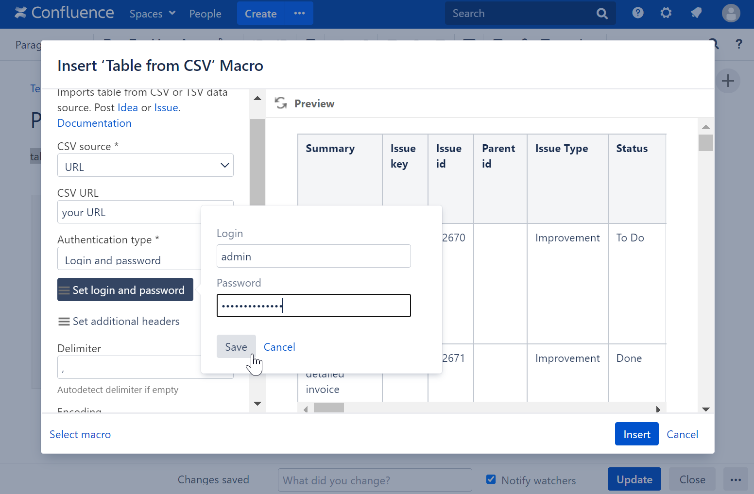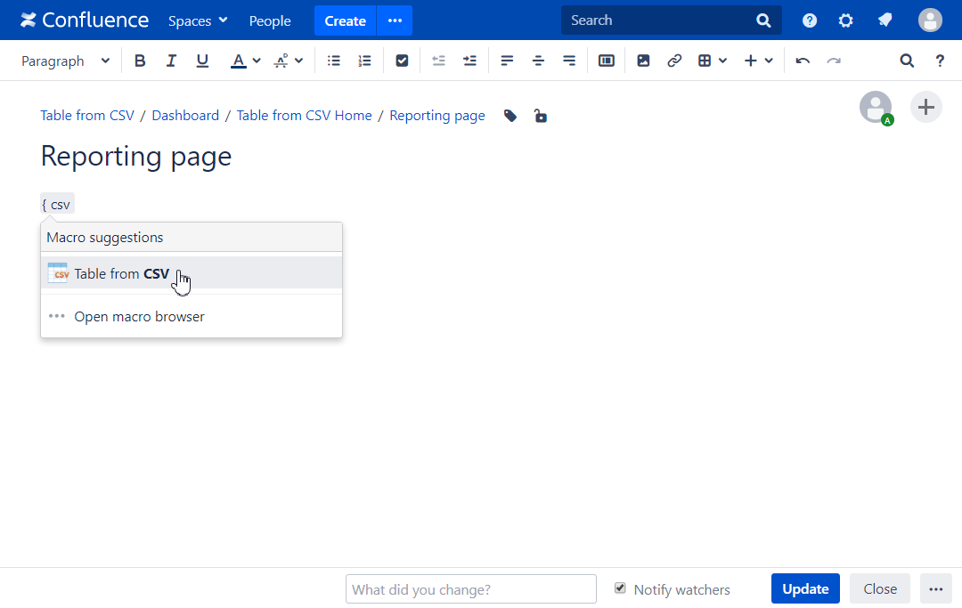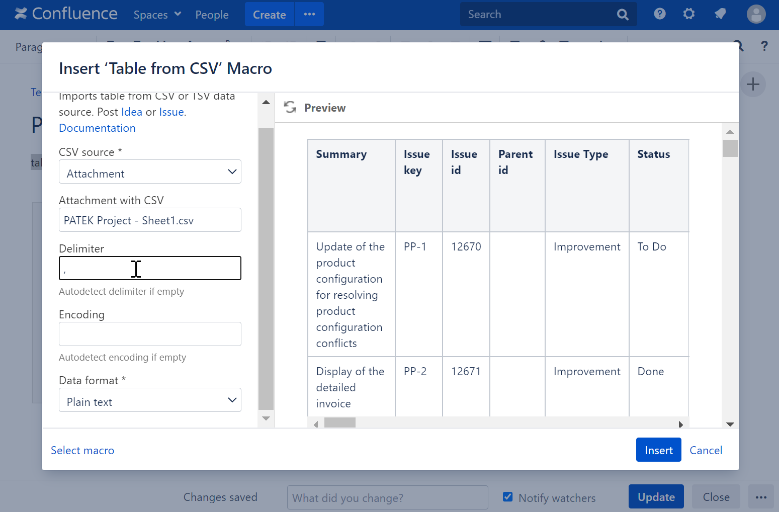 The Table from CSV macro allows you to output a table from CSV or TSV data source.