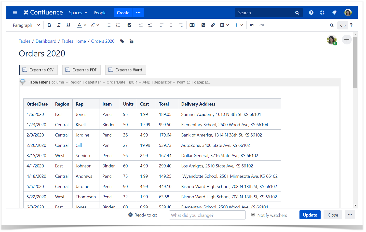 Please note that on Cloud when exporting to PDF via standard Confluence tools, you'll get the tables modified by our macros (the page will look as you see it in the view mode). But when exporting to Word, you'll see the original tables.