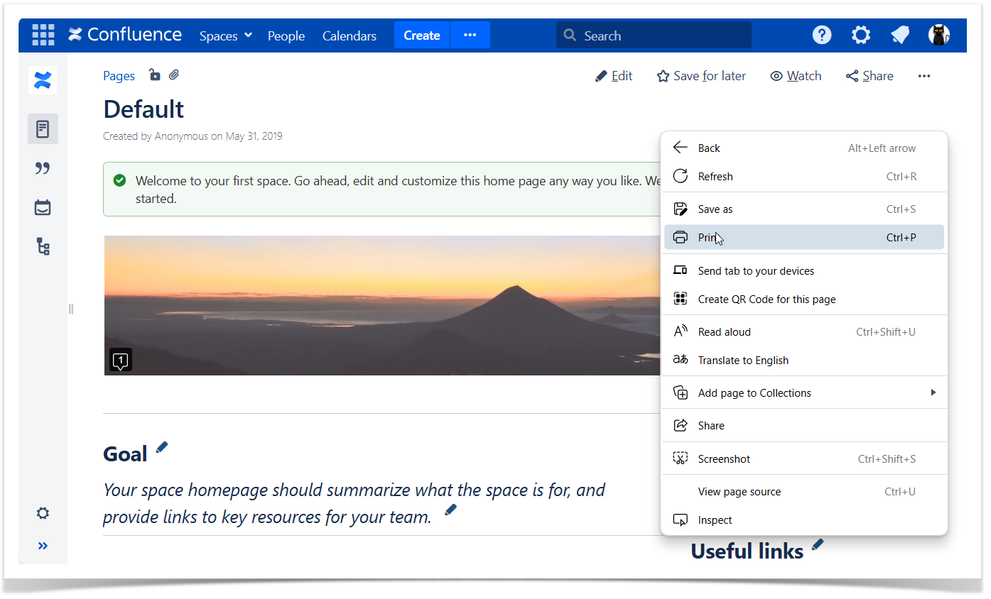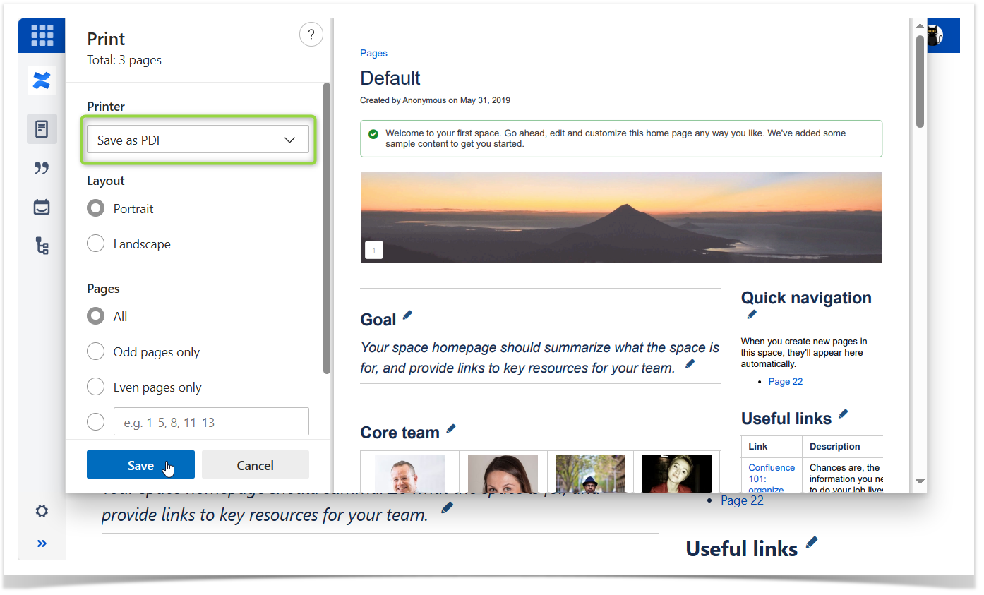 Browser printing allows to avoid any potential 3rd-party macro compatibily, default Confluence export, etc. issues that might be intermittently taking place in terms of page view display proving this option to be an effective and operational exporting alternative.
