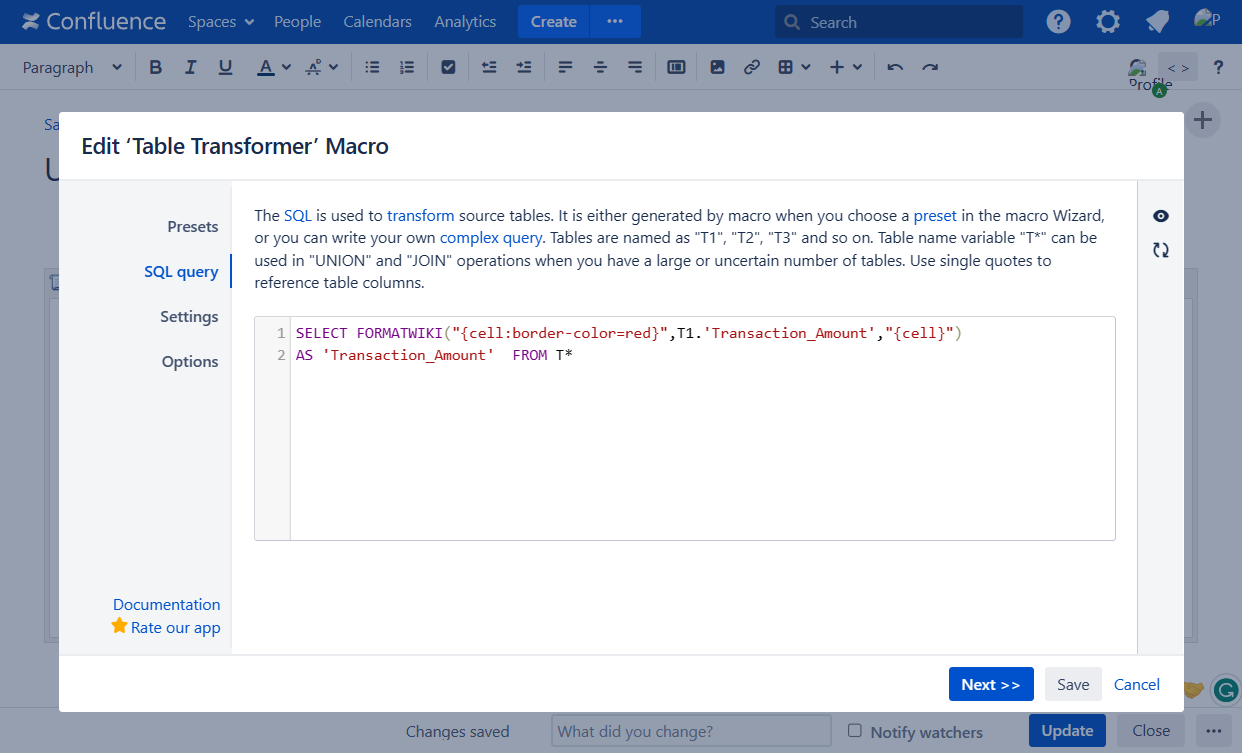 SELECT FORMATWIKI("{cell:border-color=red}",T1.'Transaction_Amount',"{cell}") AS 'Transaction_Amount' FROM T*Click Next.