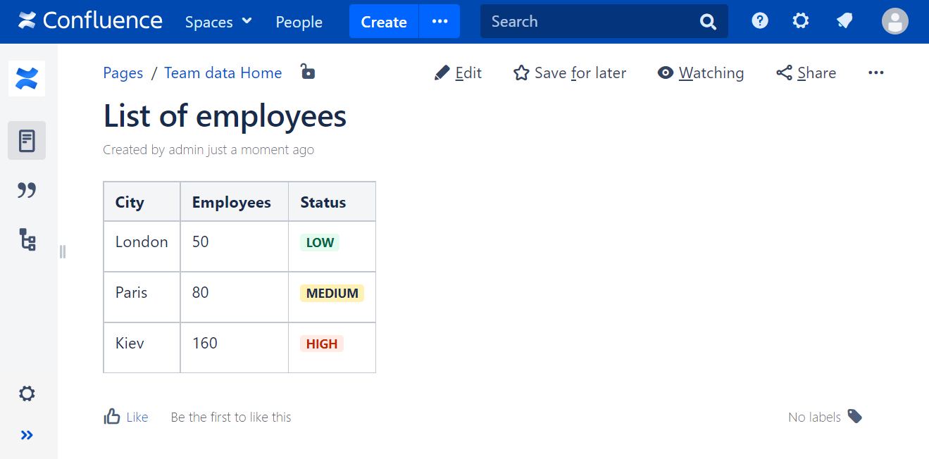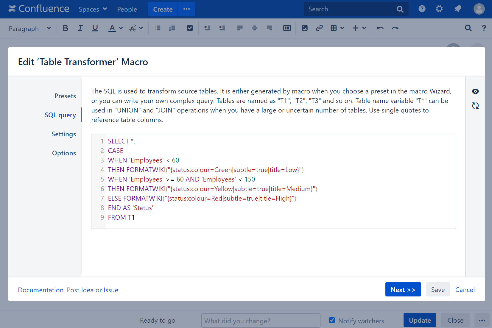 SELECT *, CASE WHEN 'Employees' < 60 THEN FORMATWIKI("{status:colour=Green|subtle=true|title=Low}") WHEN 'Employees' >= 60 AND 'Employees' < 150 THEN FORMATWIKI("{status:colour=Yellow|subtle=true|title=Medium}") ELSE FORMATWIKI("{status:colour=Red|subtle=true|title=High}") END AS 'Status' FROM T1- Click Next.